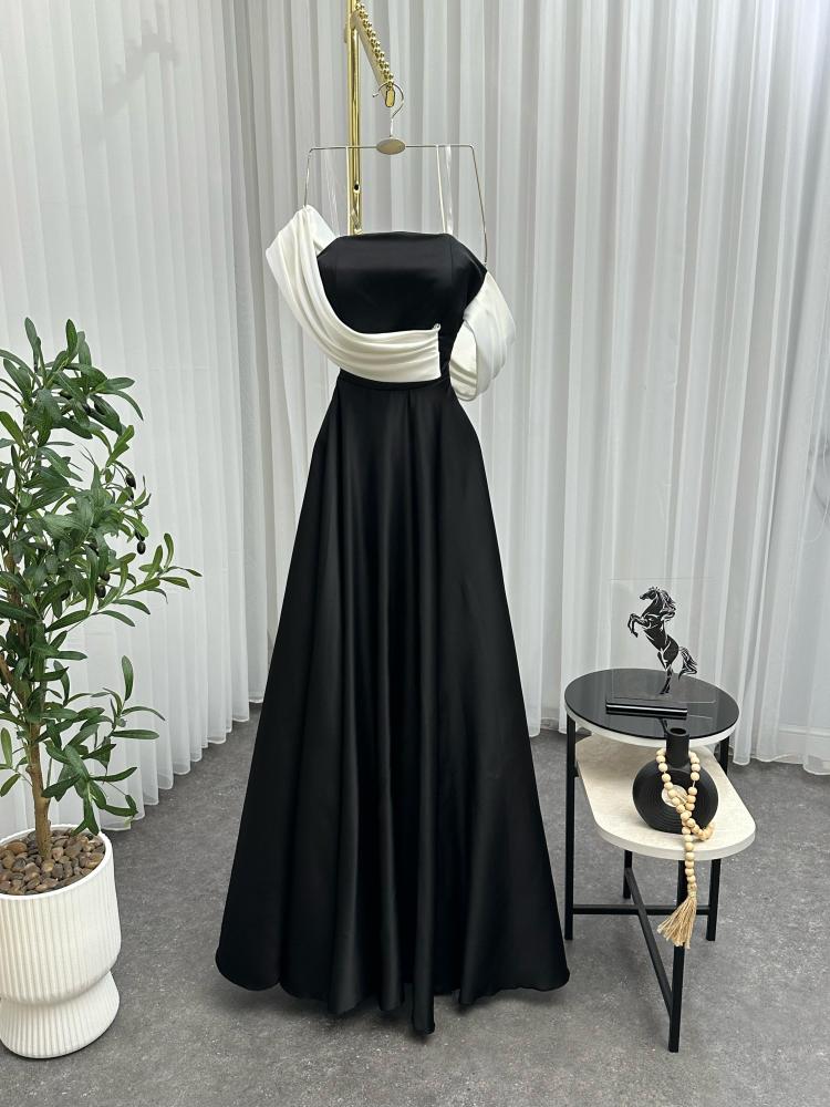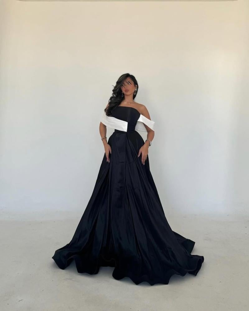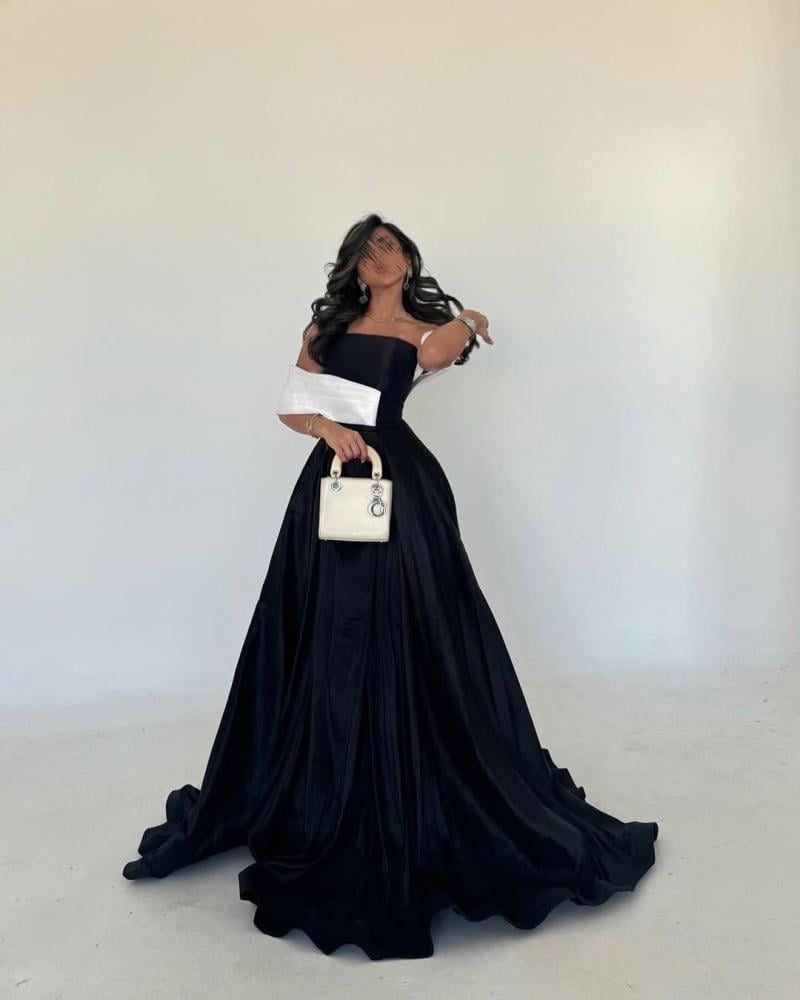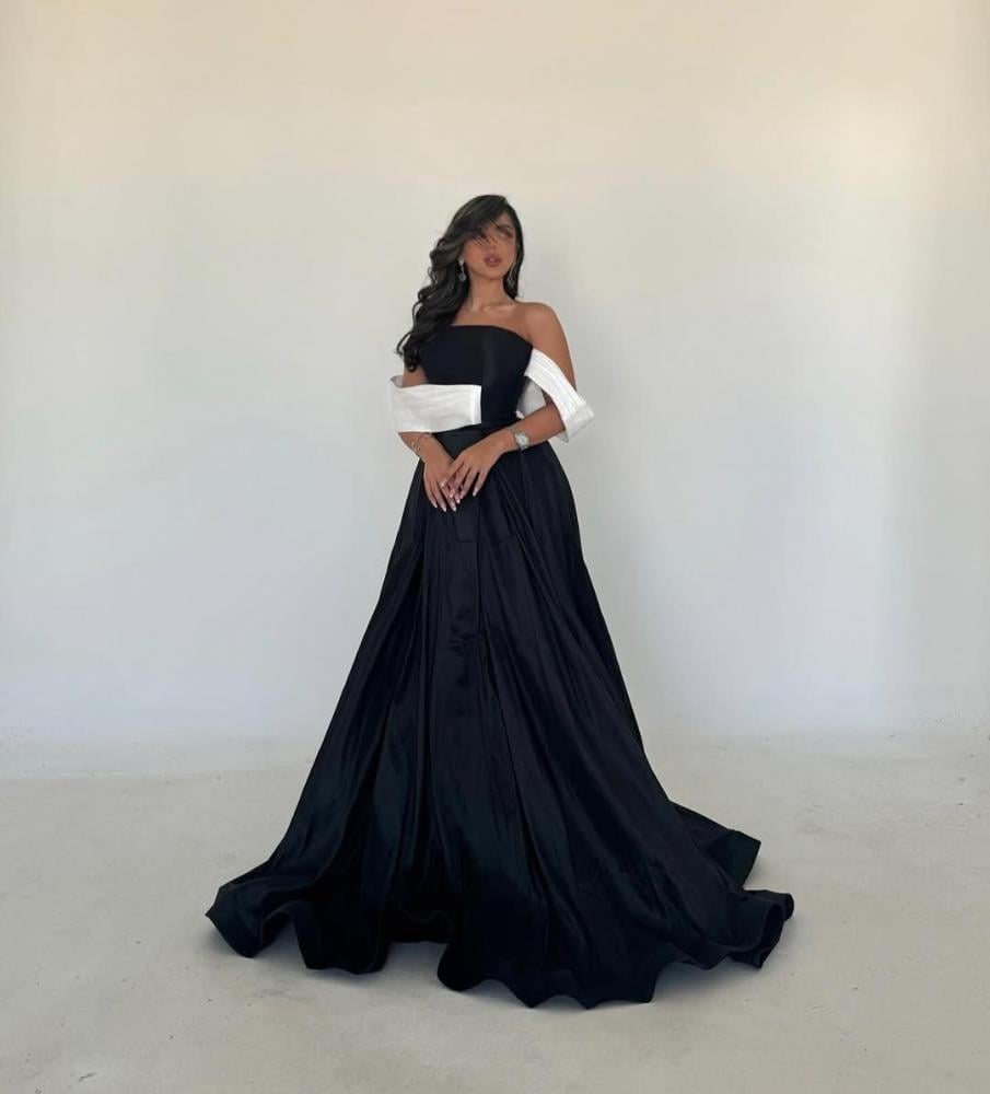 - اللون: الفستان يأتي بلونين أساسيين، الأسود والأبيض. الجزء الأكبر من الفستان باللون الأسود، مما يضفي عليه طابعًا راقيًا وكلاسيكيًا، بينما يضيف اللون الأبيض في الجزء العلوي لمسة من التباين الأنيق.
