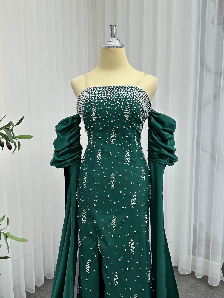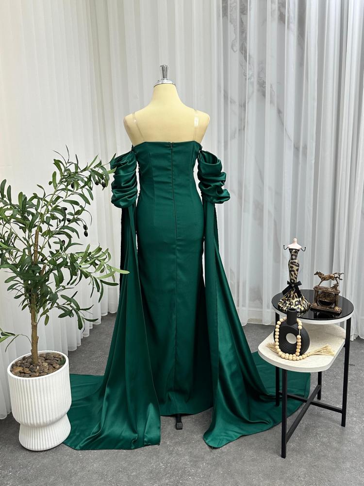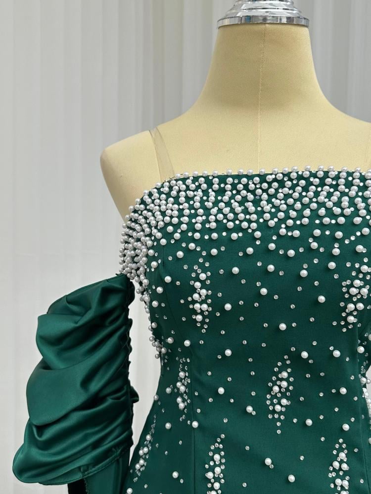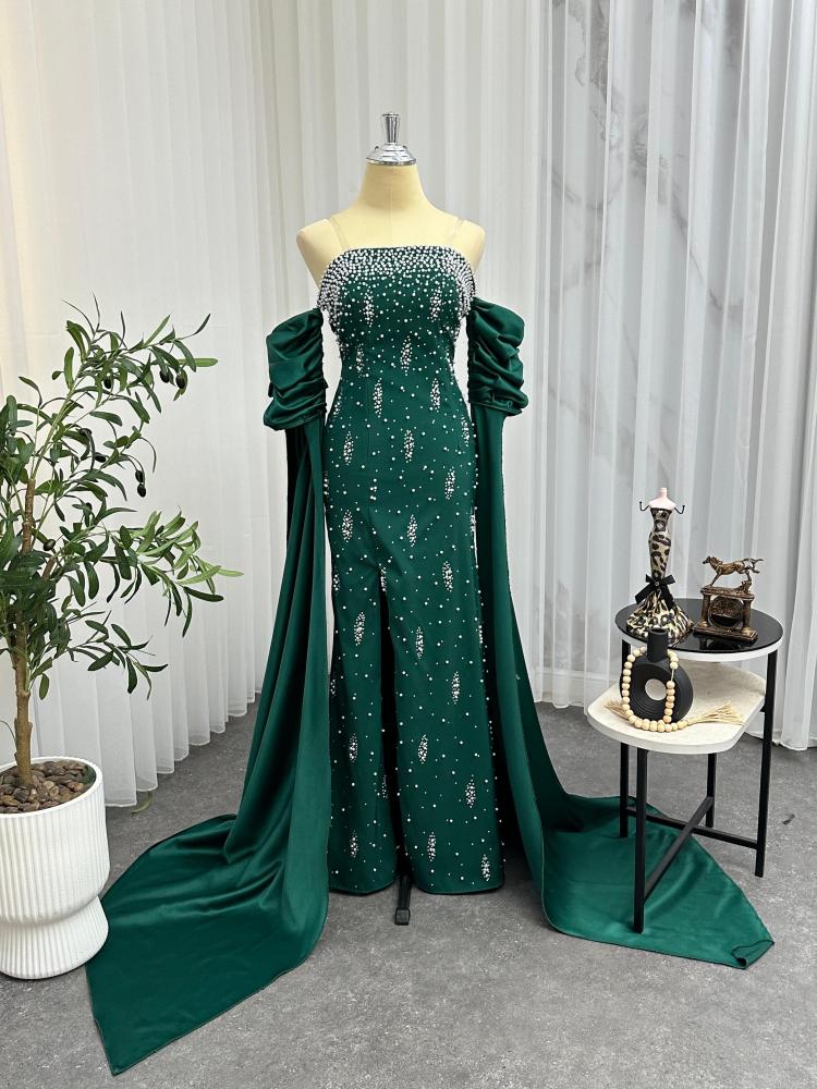 - اللون والتصميم العام:الفستان بلون أخضر زمردي داكن، لون ملكي وملفت للنظر.