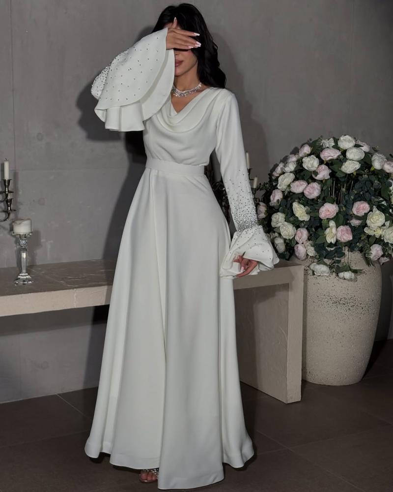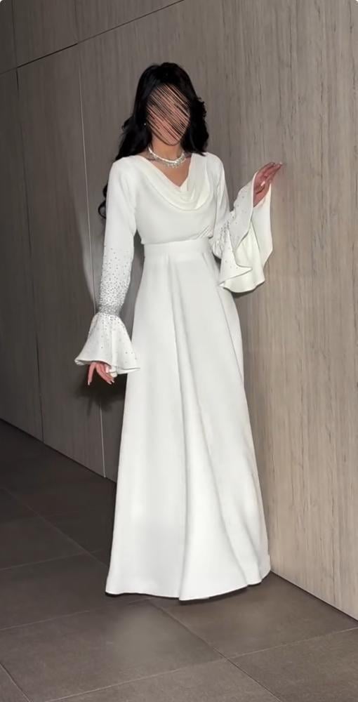 - الرقبة: بقصة "دروب" (draped neckline) ناعمة تنسدل بشكل أنثوي.