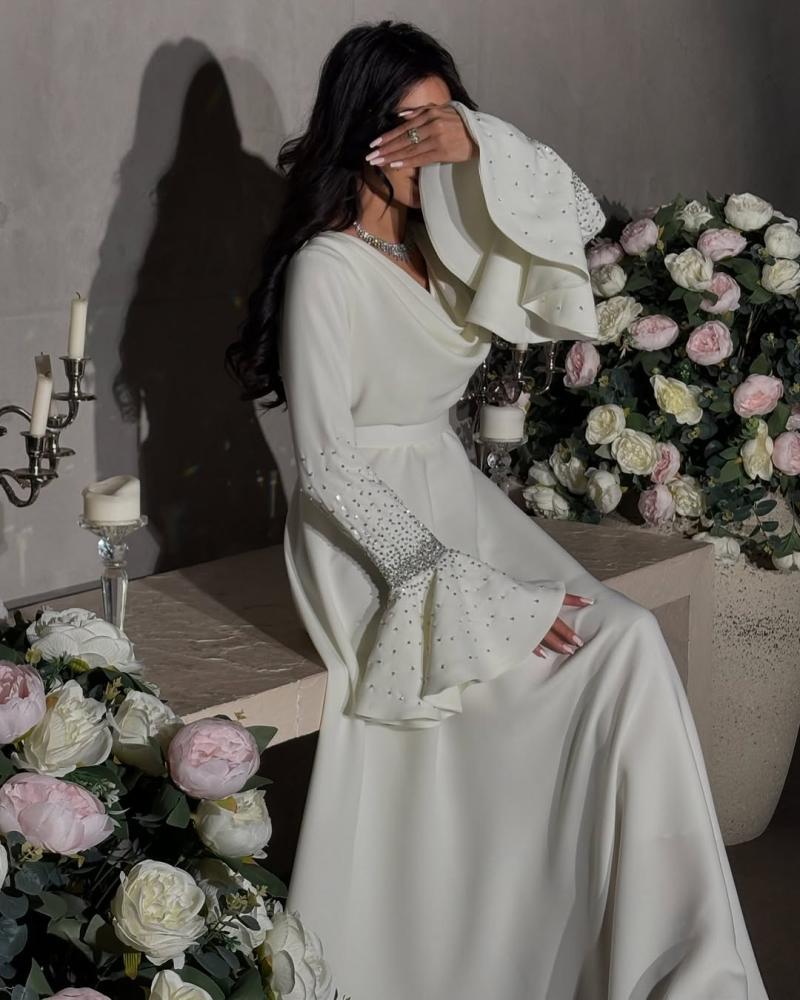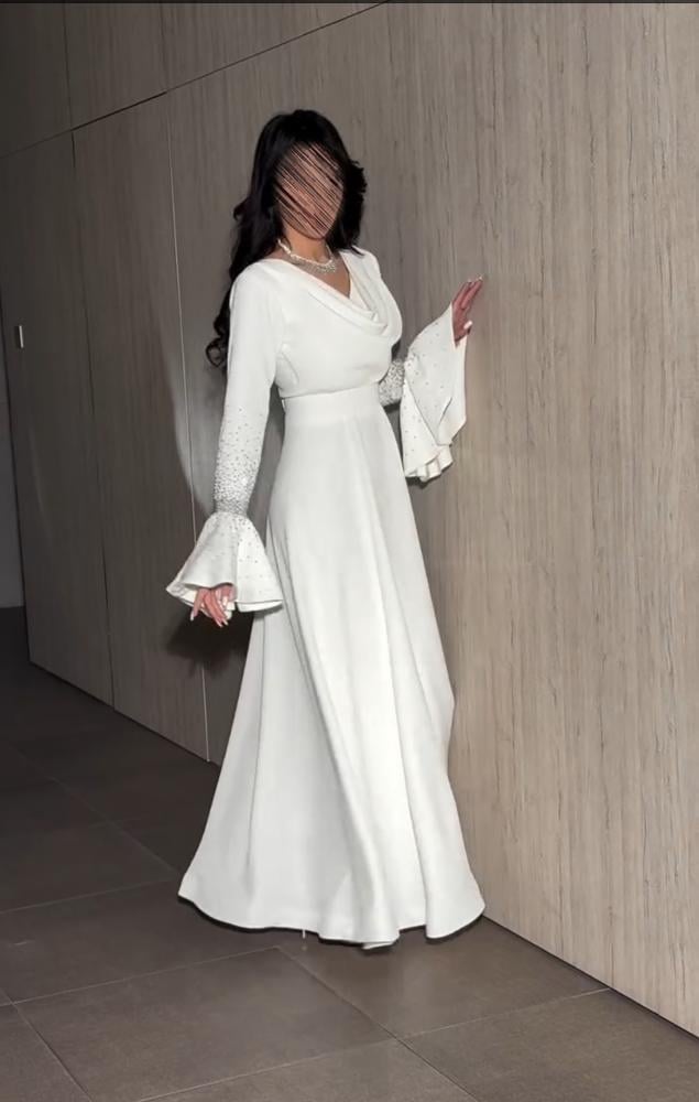 - الأكمام: طويلة جداً وواسعة عند الأطراف بأسلوب "الأكمام الجرسية"، مزينة بتطريز ناعم من الخرز أو الكريستالات الصغيرة عند النصف السفلي من الأكمام، ما يضيف لمسة فاخرة.