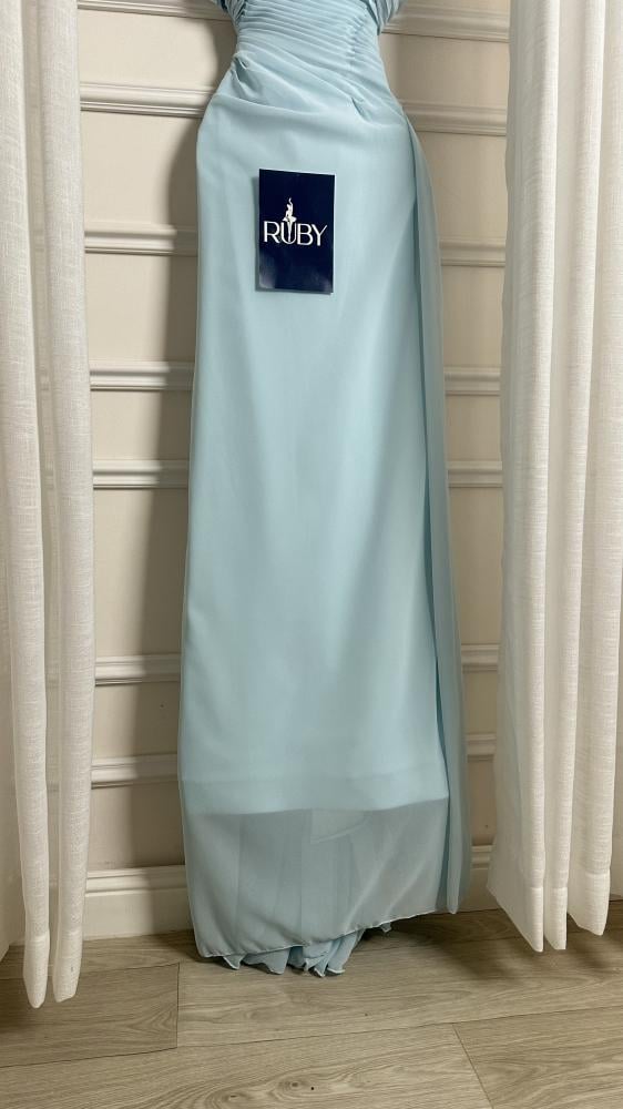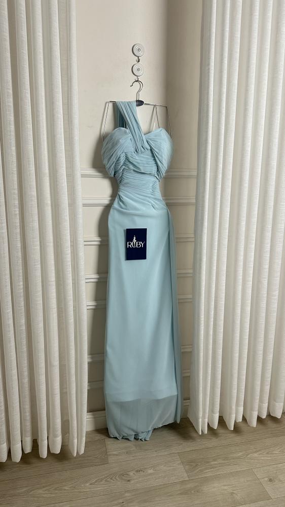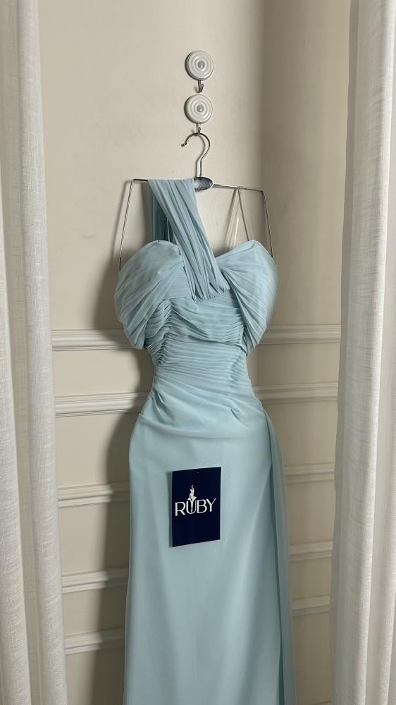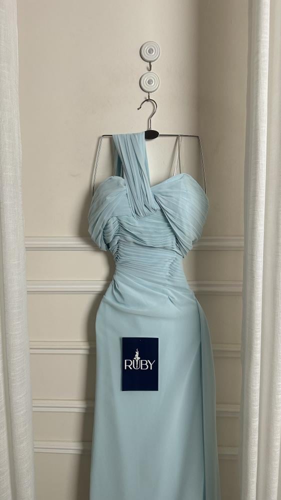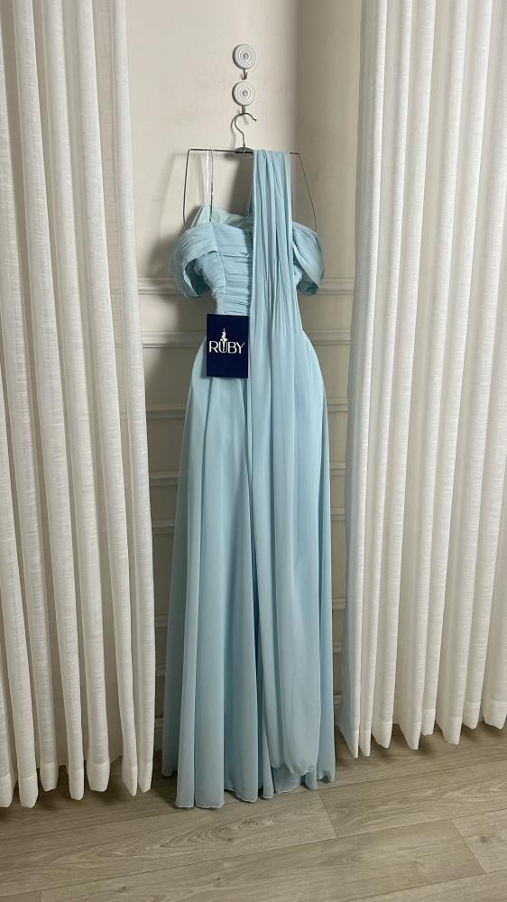- اللون والخامة: الفستان بلون أزرق سماوي فاتح، مصنوعًا من قماش خفيف ومنسدل من الشيفون ، مما يمنحه مظهرًا ناعمًا وانسيابيًا.