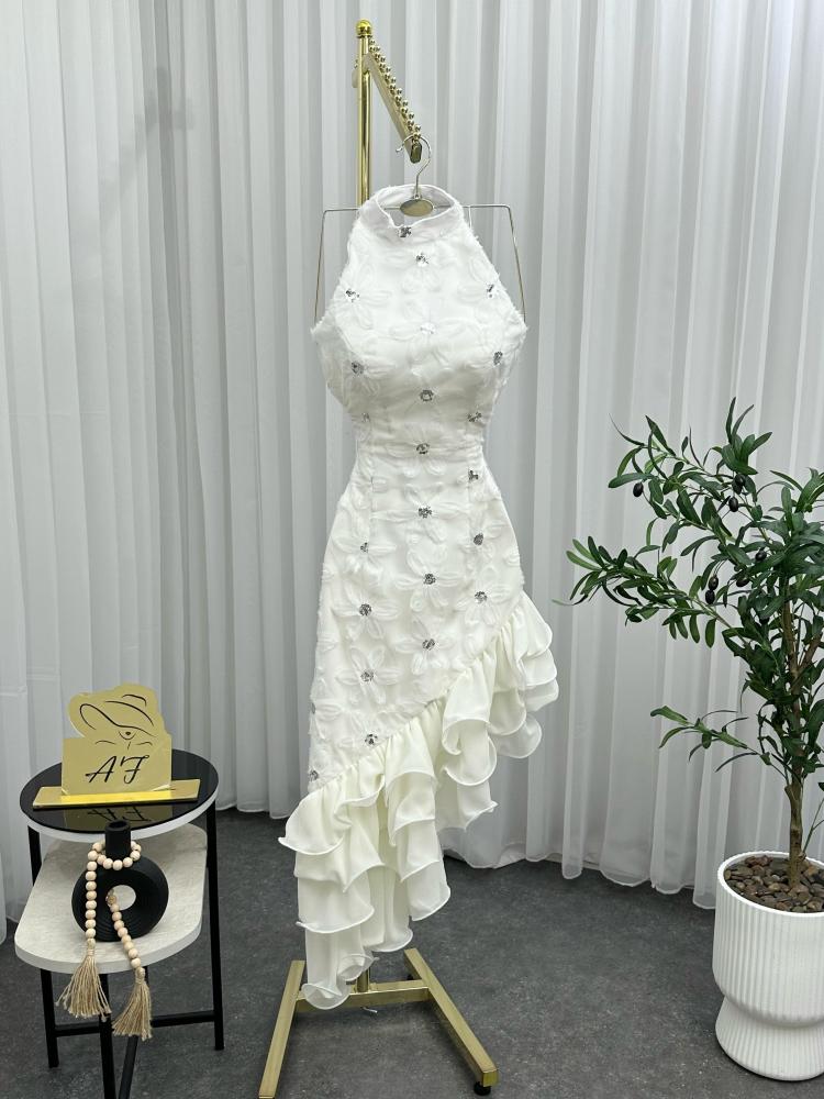 - الفستان أطول من الخلف وأقصر من الأمام، ما يكشف عن الساق بطريقة أنيقة دون أن تكون فاضحة.