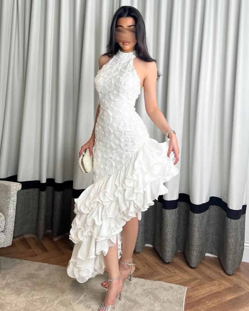 - الجهة السفلية تبدأ ضيقة ثم تنسدل بتنورة غير متماثلة مليئة بالكشكشات الناعمة (ruffles) التي تبدأ من أعلى الركبة وتنتهي بأسفل القدم، مما يخلق حركة وانسيابية رائعة عند المشي.