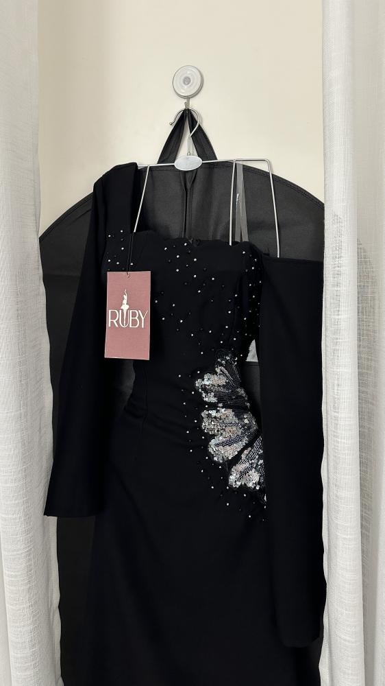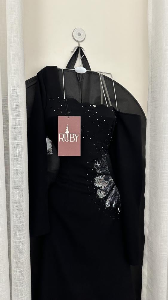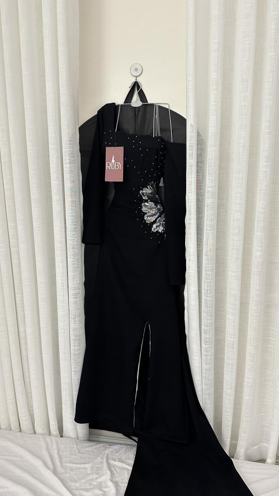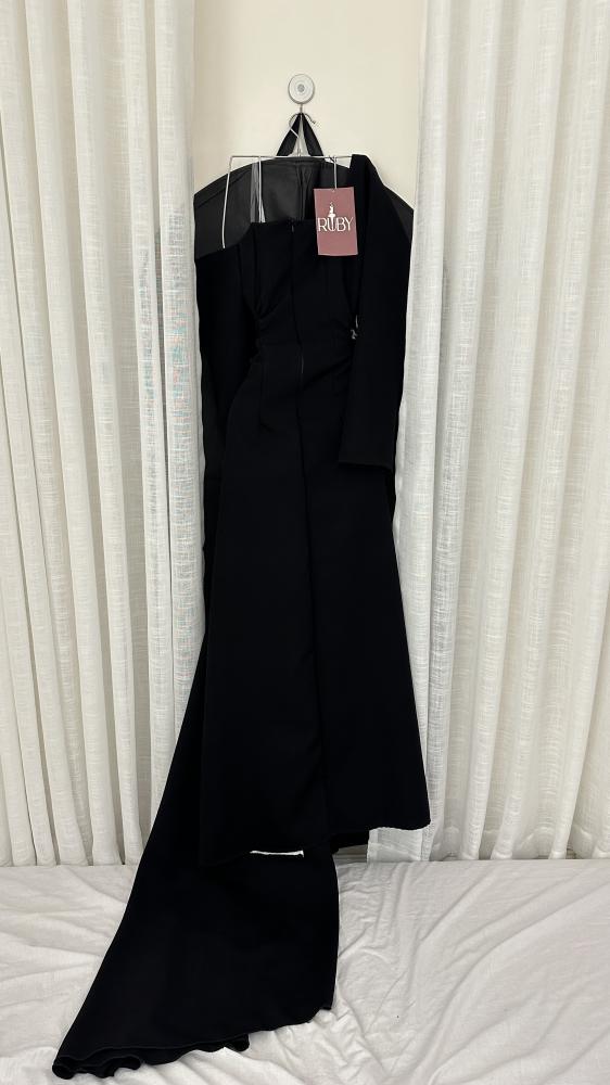 - الخصر: محدد بحزام عريض من نفس القماش، مع تفاصيل متدلية أو وشاح ينسدل على جانب الفستان.