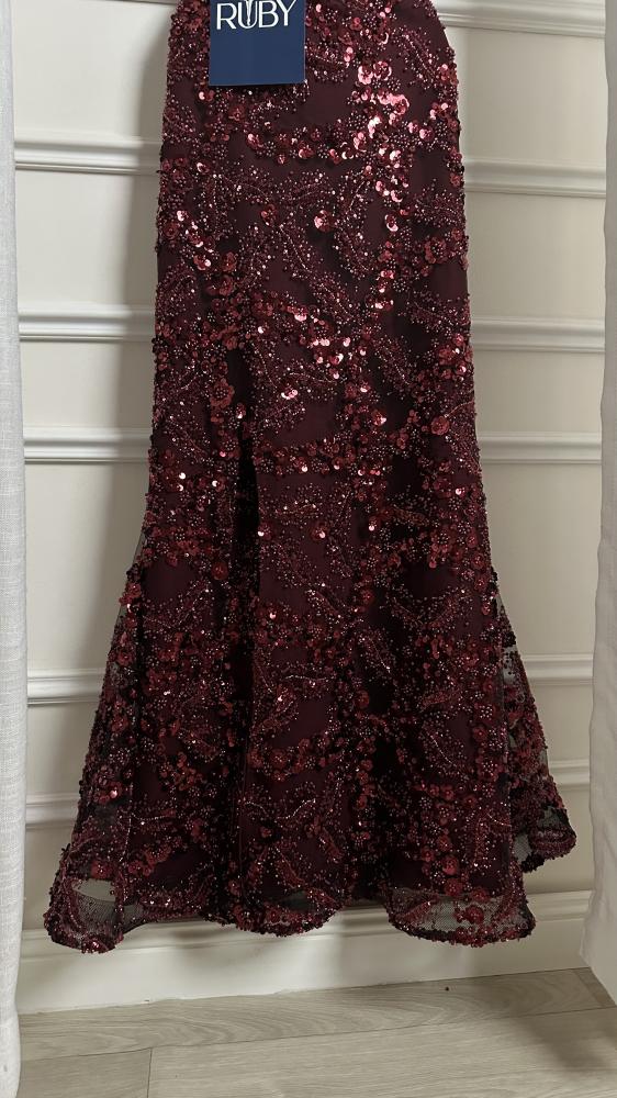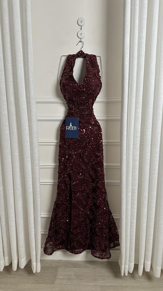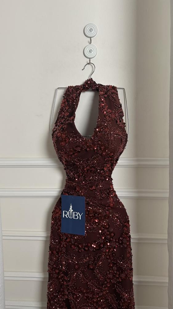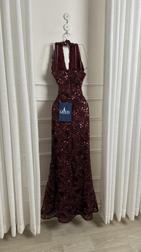 - مصنوع من قماش مطرز بالكامل بالترتر و الخرز اللامع الذي يغطي الفستان بالكامل، مما يمنحه لمعاناً وبريقاً.