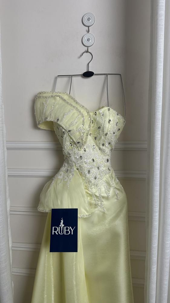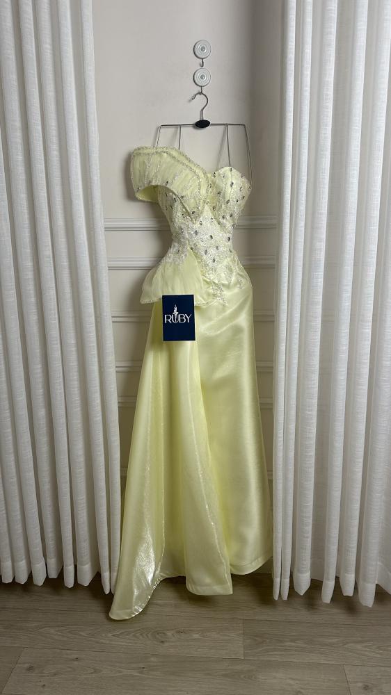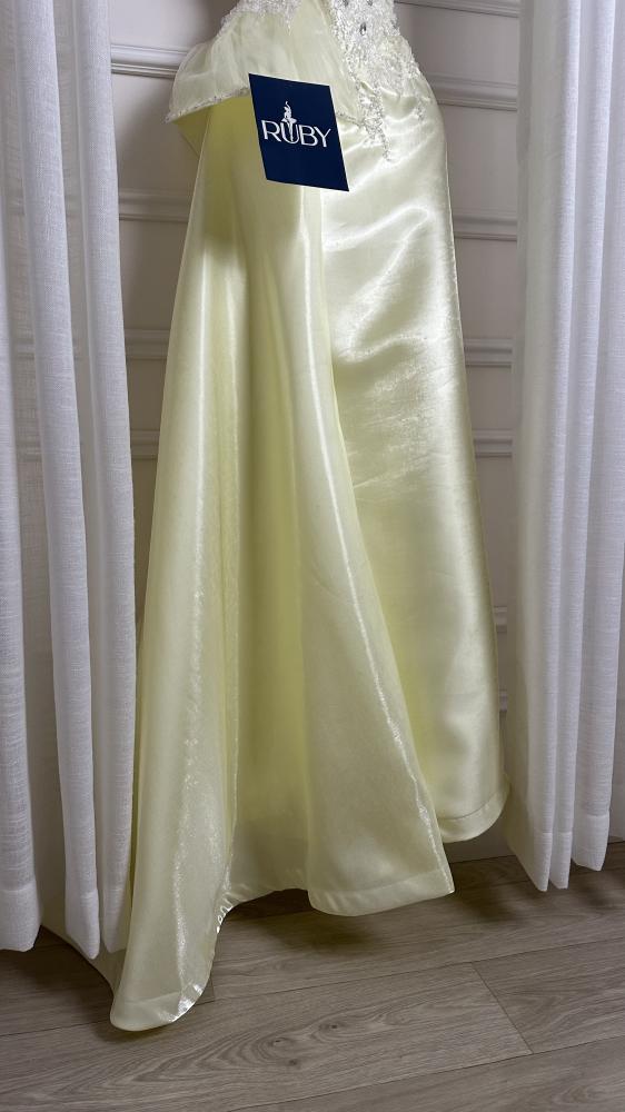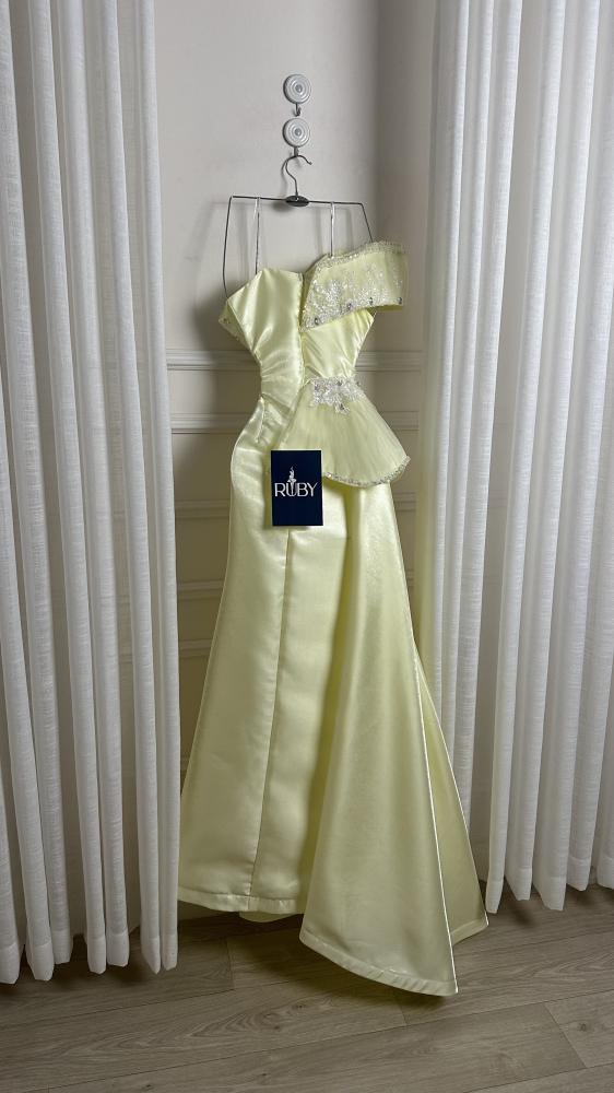 - التصميم: تصميم "أوف شولدر" (مكشوف الأكتاف) مع أكمام قصيرة ومنفوشة قليلاً.