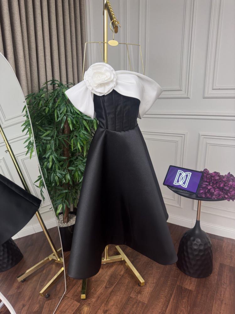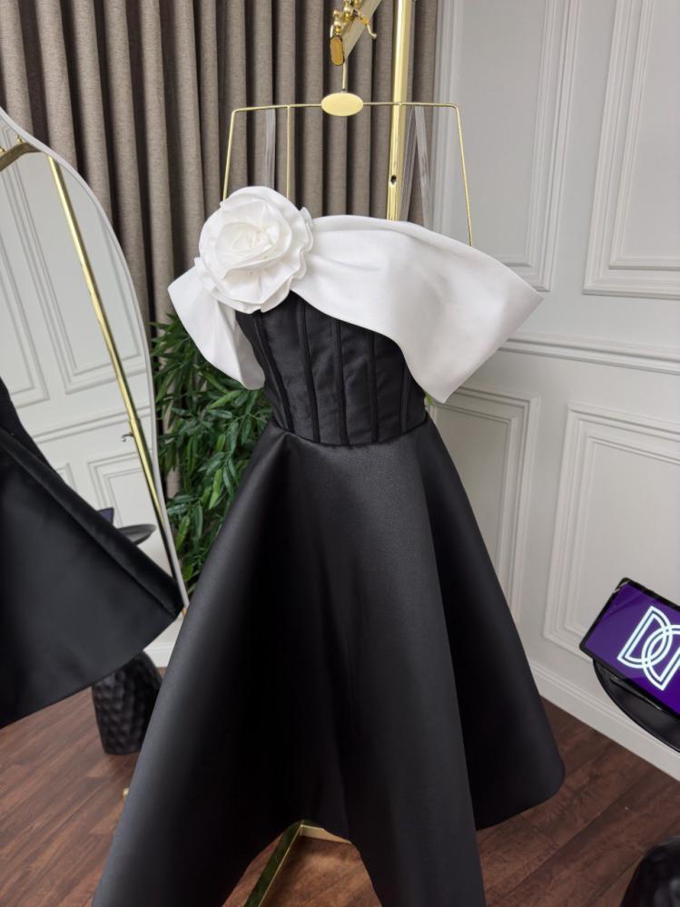 - الزينة: وردة كبيرة من القماش الأبيض على الكتف الأيسر تضيف لمسة رومانسية.