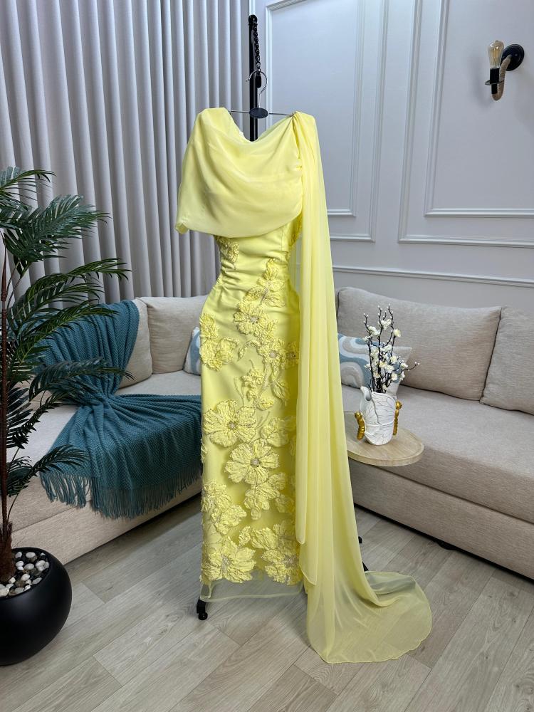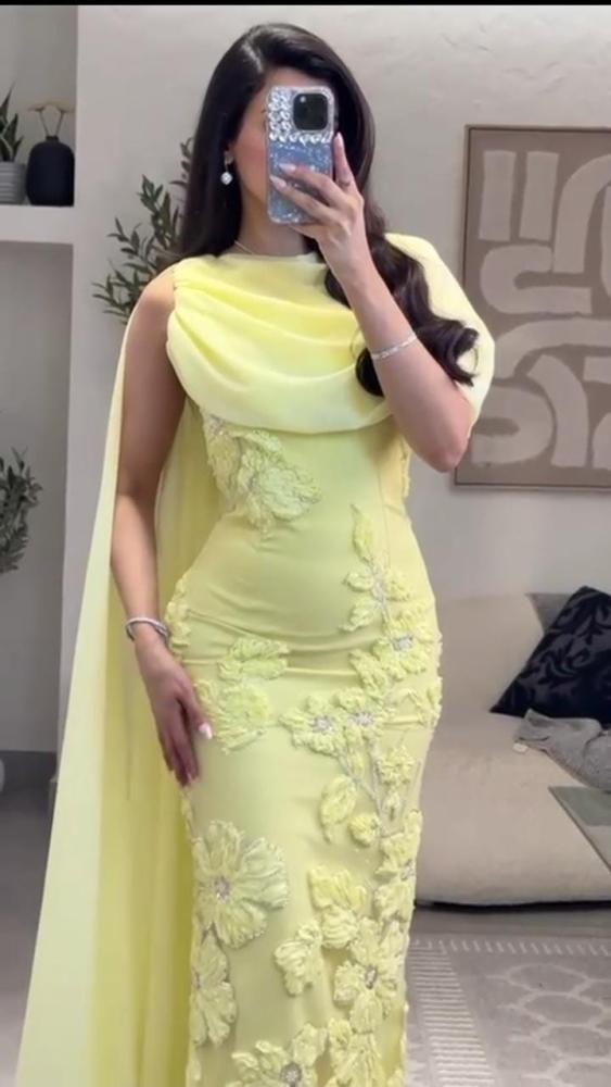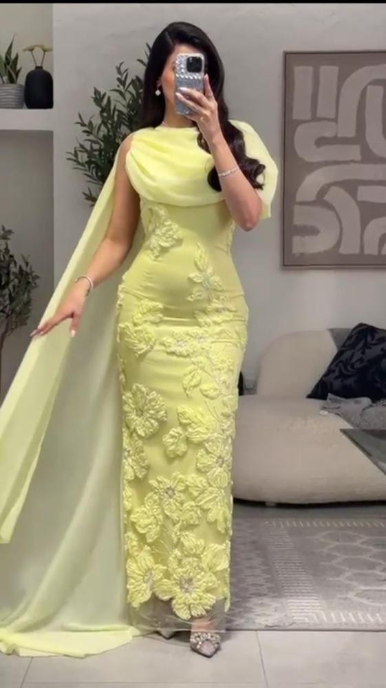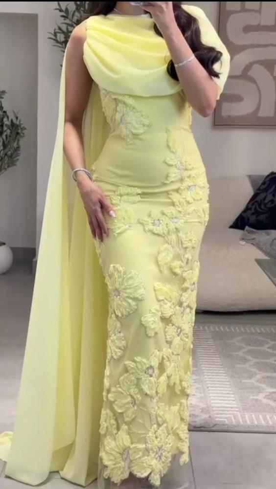 - الفستان بلون أصفر ليموني فاتح، بقصة ضيقة ومحددة للجسم (Mermaid style)، مع ذيل طويل يمتد من الخلف.