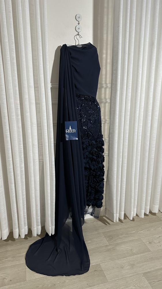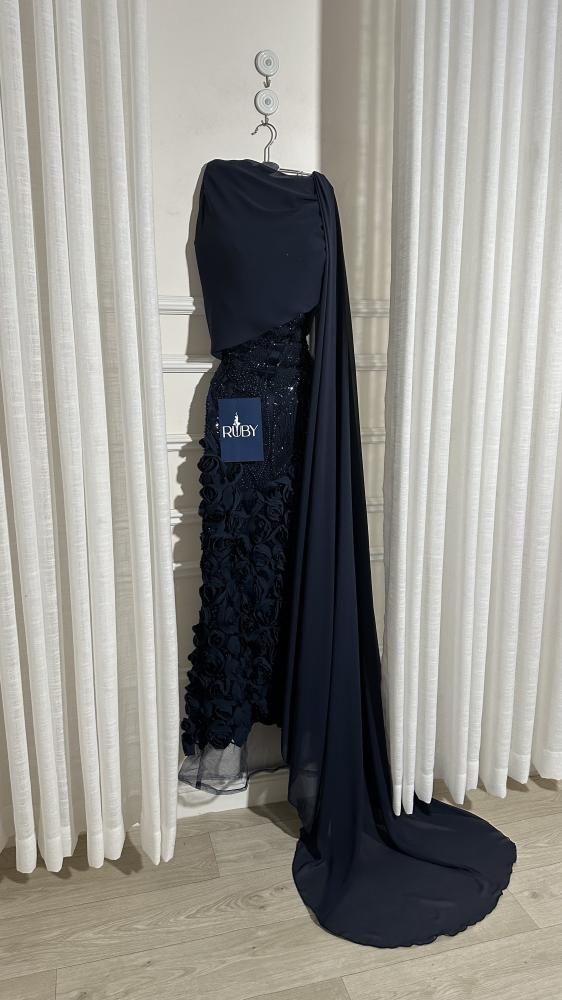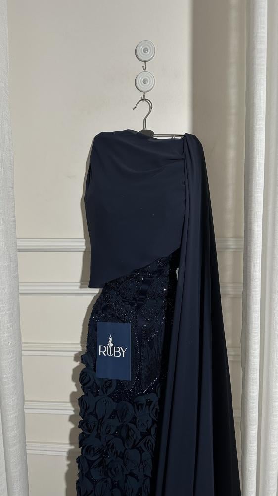 - اللون والخامة: الفستان كحلي داكن، ويبدو أن الجزء السفلي منه مزين بتطريز أو تفاصيل بارزة ثلاثية الأبعاد تشبه الزهور المصنوعة من القماش، مما يمنحه مظهرًا فخمًا. الجزء العلوي من الفستان يبدو أكثر بساطة مع شال طويل من الشيفون أو قماش مماثل ينسدل من أحد الكتفين، مما يضيف لمسة من الأناقة والانسيابية.