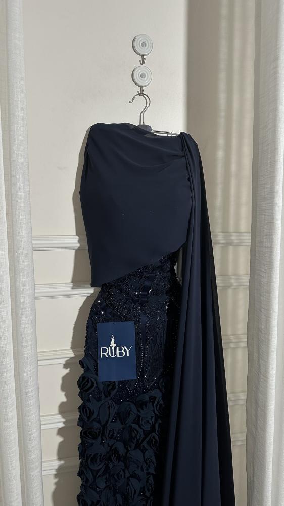 - التصميم: الفستان طويل، مصمم بقصة أنيقة ومناسبة للسهرات والمناسبات الرسمية، مع وجود علامة تجارية تحمل اسم "RUBY"