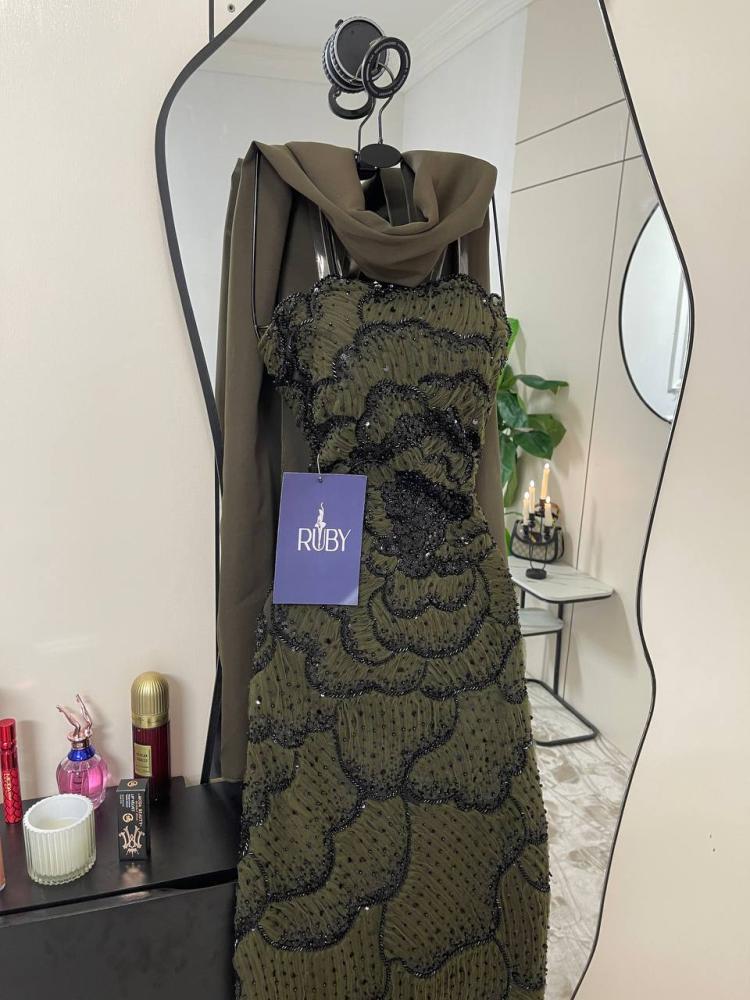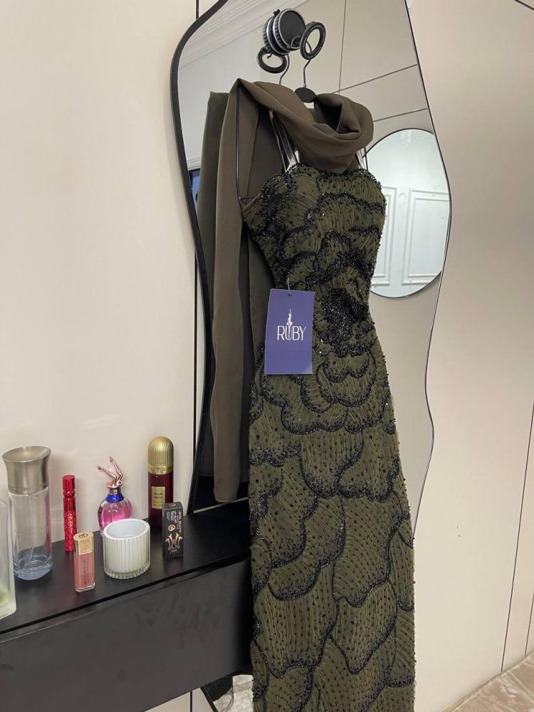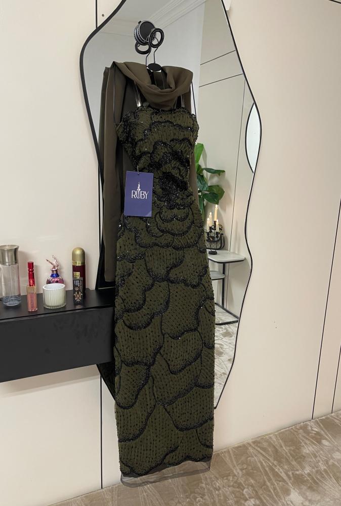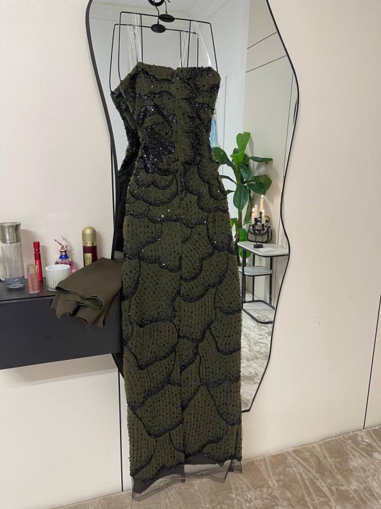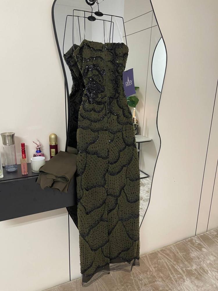 اللون: زيتي داكن.التصميم: فستان سهرة طويل بقصة ضيقة (ميدي).التفاصيل: مزين بالكامل بالخرز الأسود اللامع.الخامة: قماش مشغول بالخرز.المناسبات: مناسب للسهرات والمناسبات الرسمية.