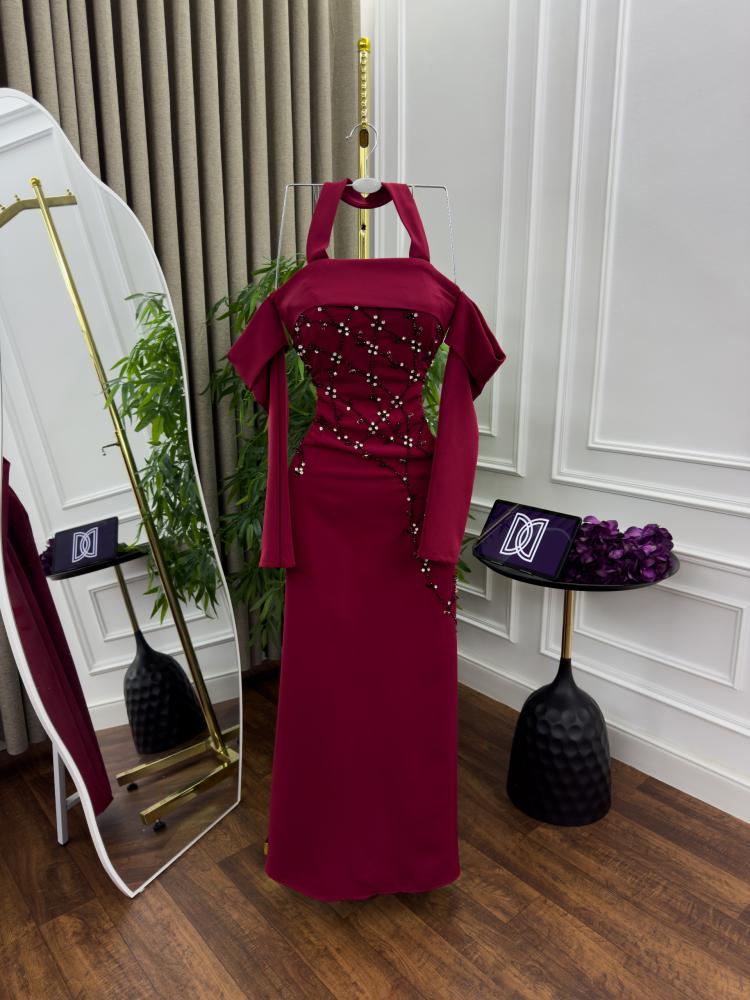 - الجزء الأمامي من الفستان مزين بشبكة هندسية من الخرز اللؤلؤي واللامع بألوان متناسقة مع اللون النبيتي.
