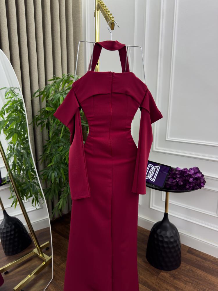 - أكمام متدلية على الأذرع (Draped Sleeves) متصلة بالفستان عند الجزء العلوي للصدر وتنسدل بطول متوسط بطريقة أنيقة.