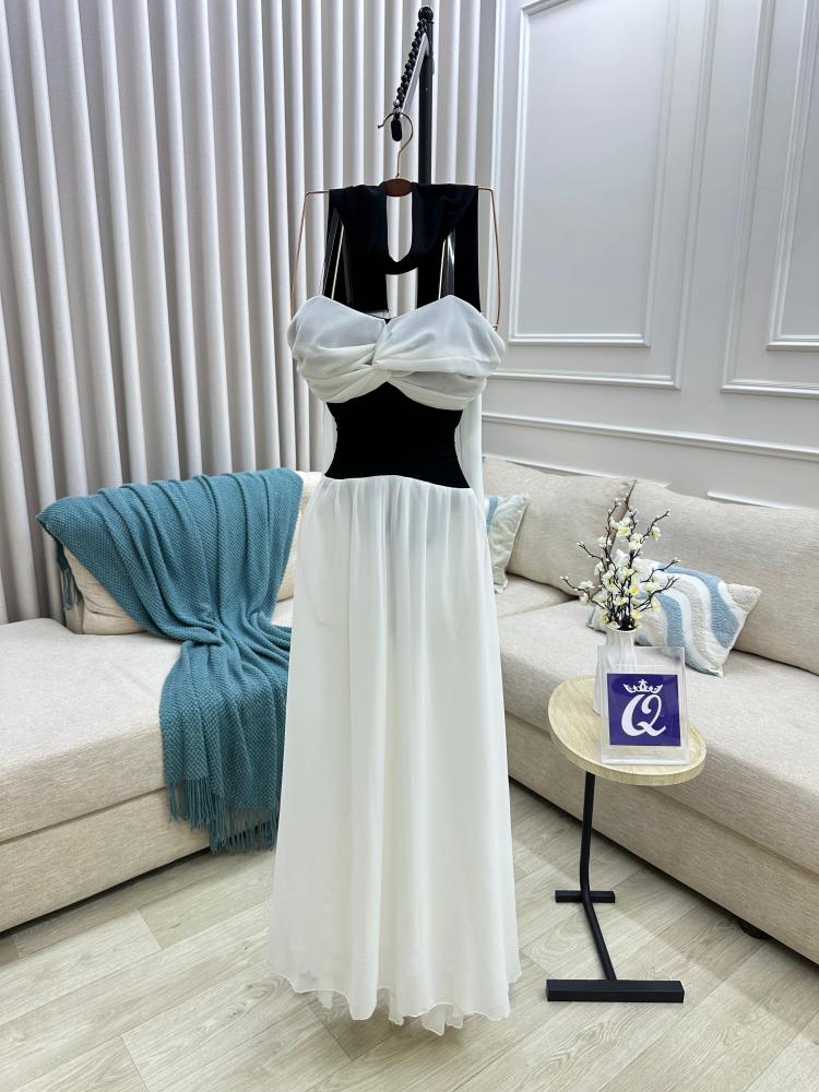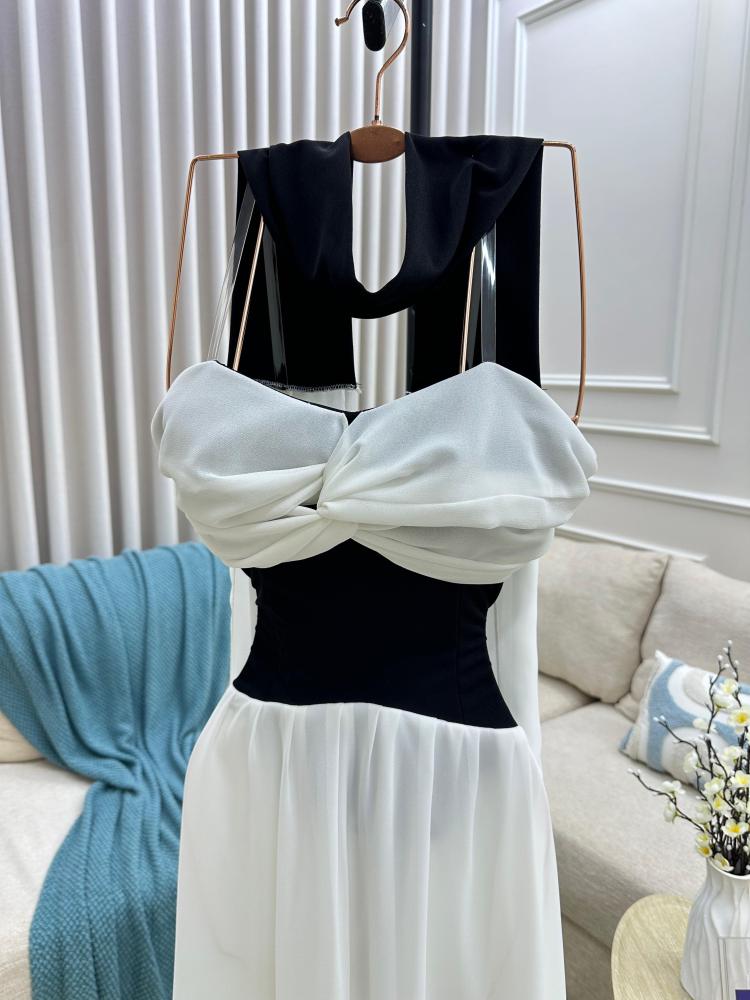 - الرقبة مزودة بحزام أو ربطة سوداء تتصل بالكورسيه، مما يمنح الفستان مظهرًا أنيقًا ومترابطًا.