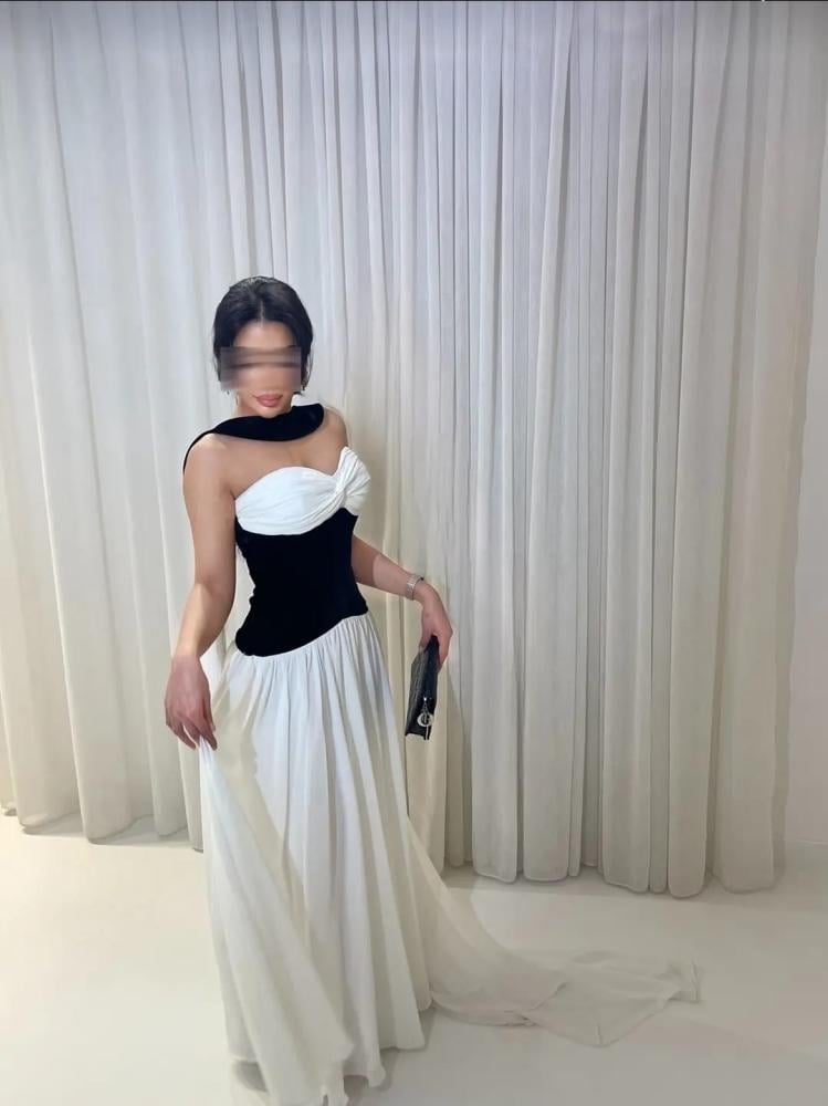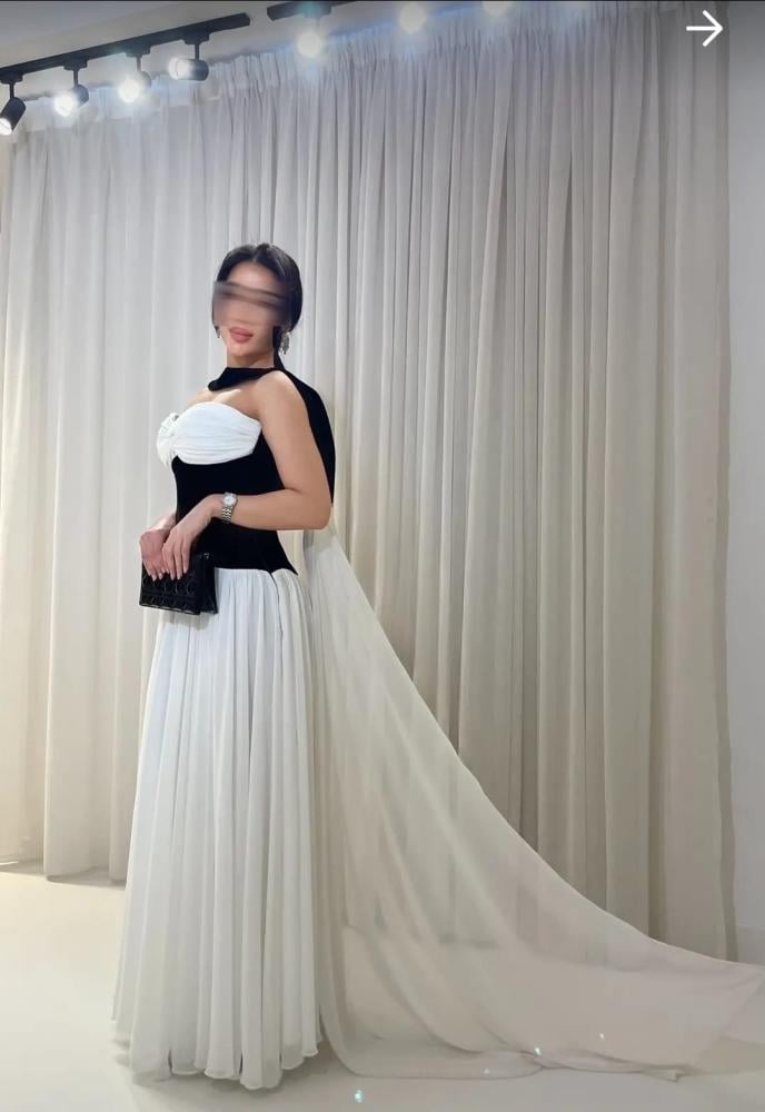 - الفستان يحتوي على ذيل طويل من نفس قماش التنورة (شيفون أبيض) يبدأ من الكتف الخلفي أو الظهر، ينسدل خلف الفستان بطريقة درامية وأنيقة، يعزز الإطلالة الفاخرة.
