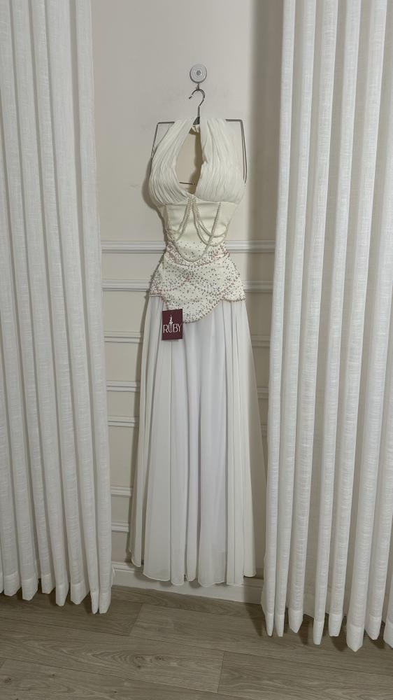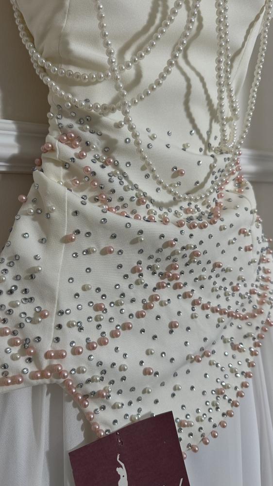 - الزينة: مزين بتطريزات دقيقة من الخرز اللامع باللون الأبيض والوردي الفاتح، تتوزع بشكل كثيف على منطقة الخصر وتتدلى منها سلاسل من الخرز الأبيض.