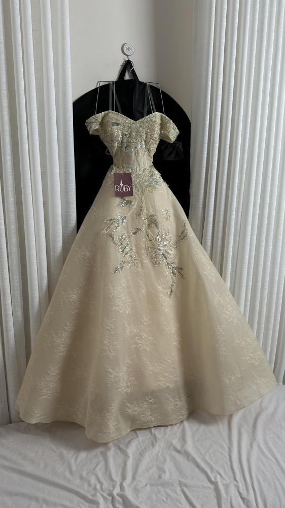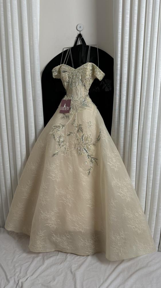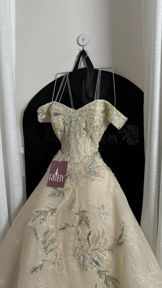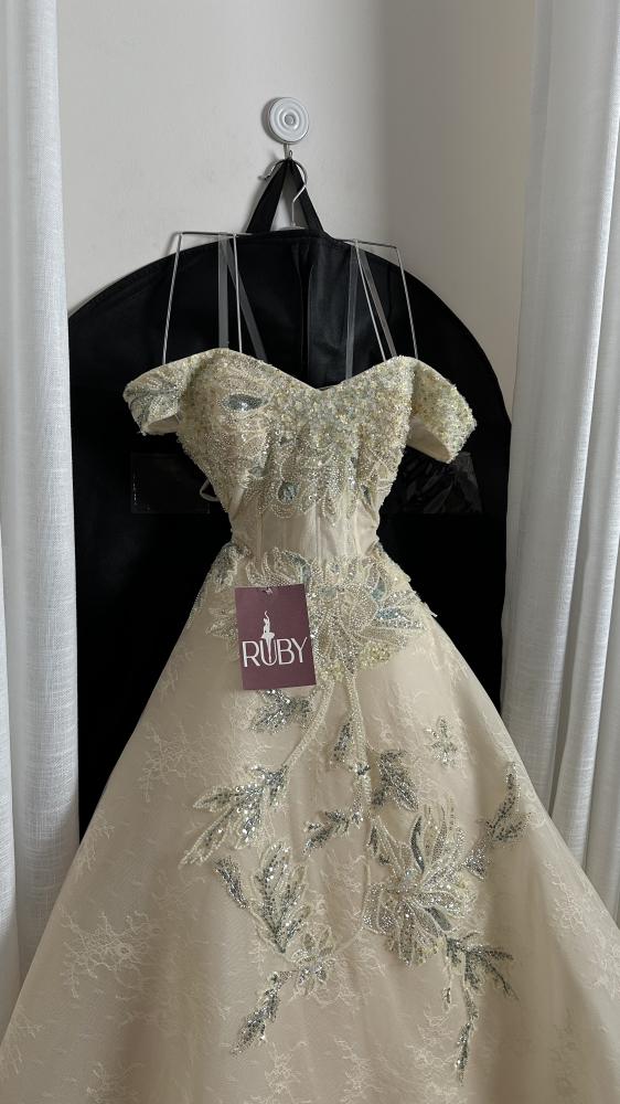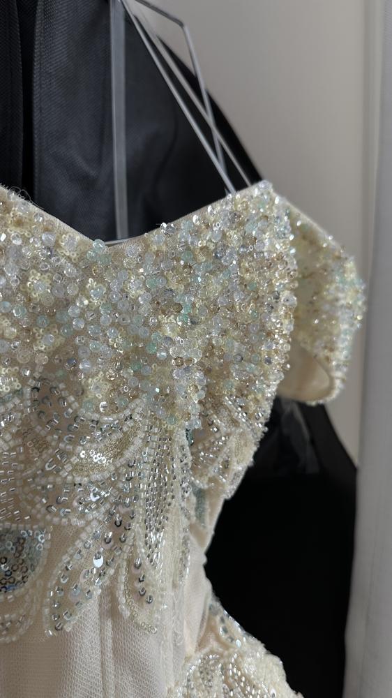 • القماش والتطريز: مصنوع من قماش دانتيل درجه اولى، ومزين بتطريزات فضية أو بلون فاتح على شكل أزهار أو فروع متناثرة على الصدر والجزء العلوي من التنورة.
