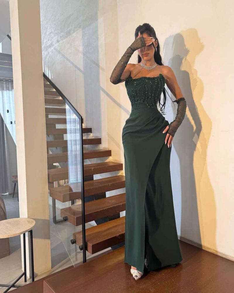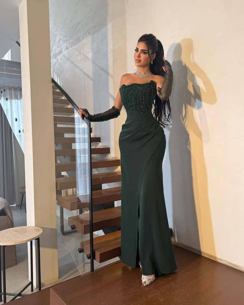 - القَصّة: قصة حورية البحر (Mermaid Cut) ضيقة تُبرز الخصر وتنحت الجسم، مع شق أمامي أنيق يسمح بإبراز جزء من الساق.