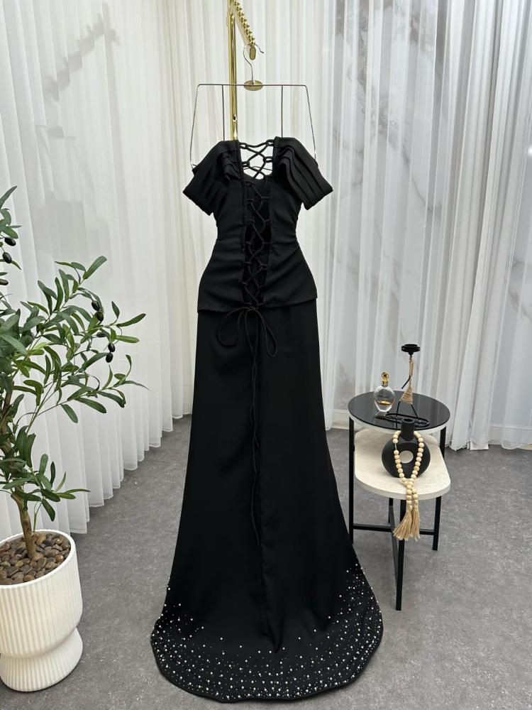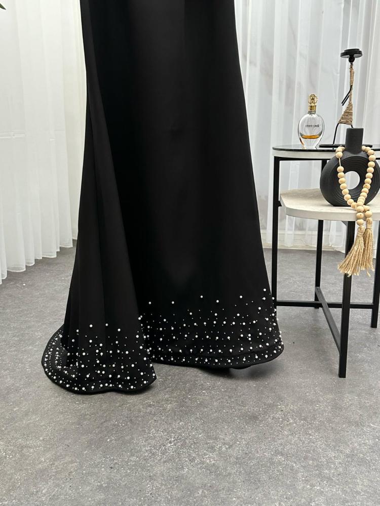 - يتميز بتطريزات أو تفاصيل براقة صغيرة (مثل الخرز أو الكريستالات) عند الحاشية السفلية، ما يضيف لمسة لامعة بدون مبالغة.