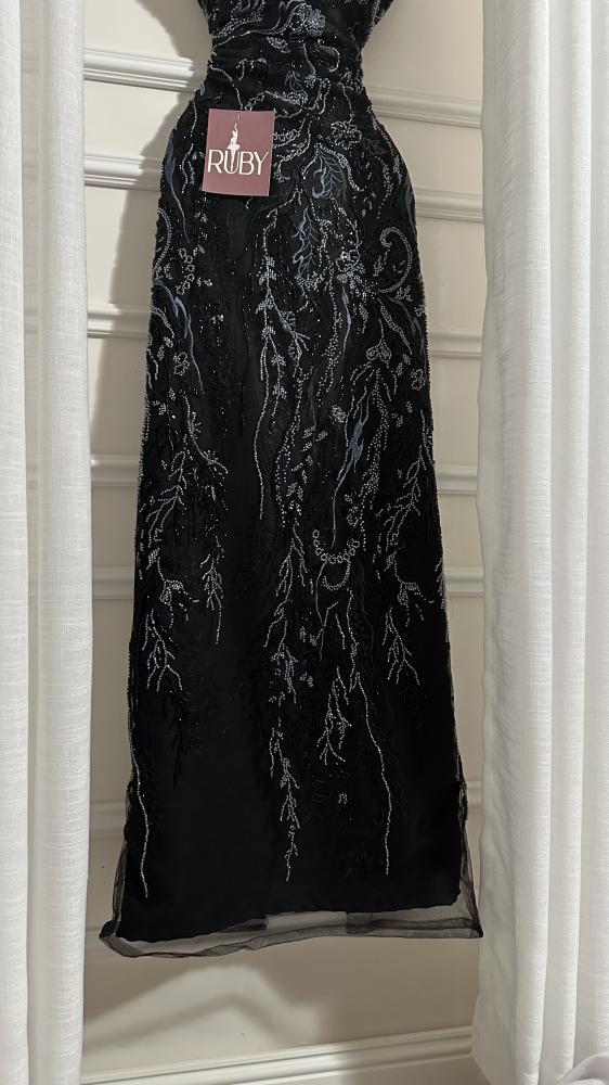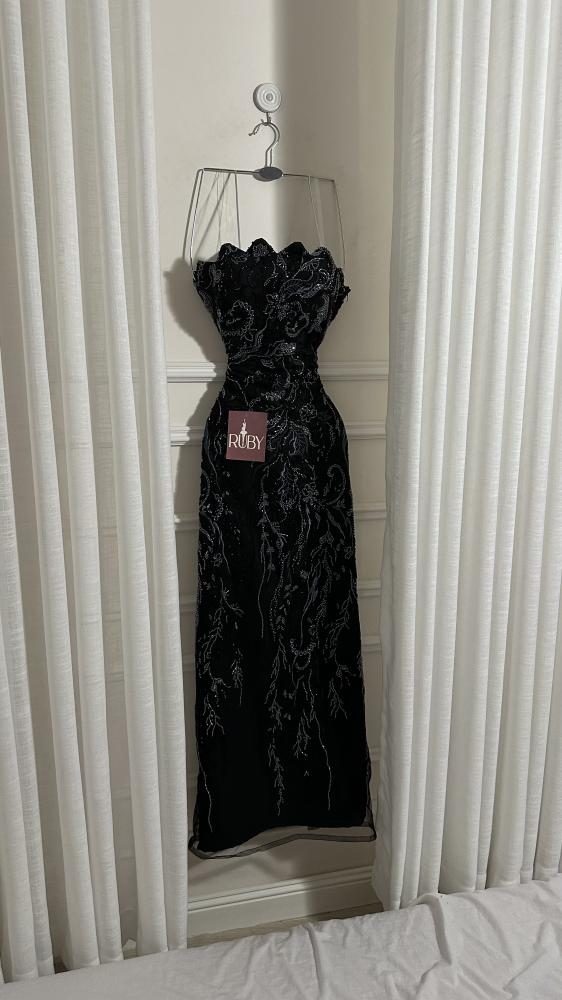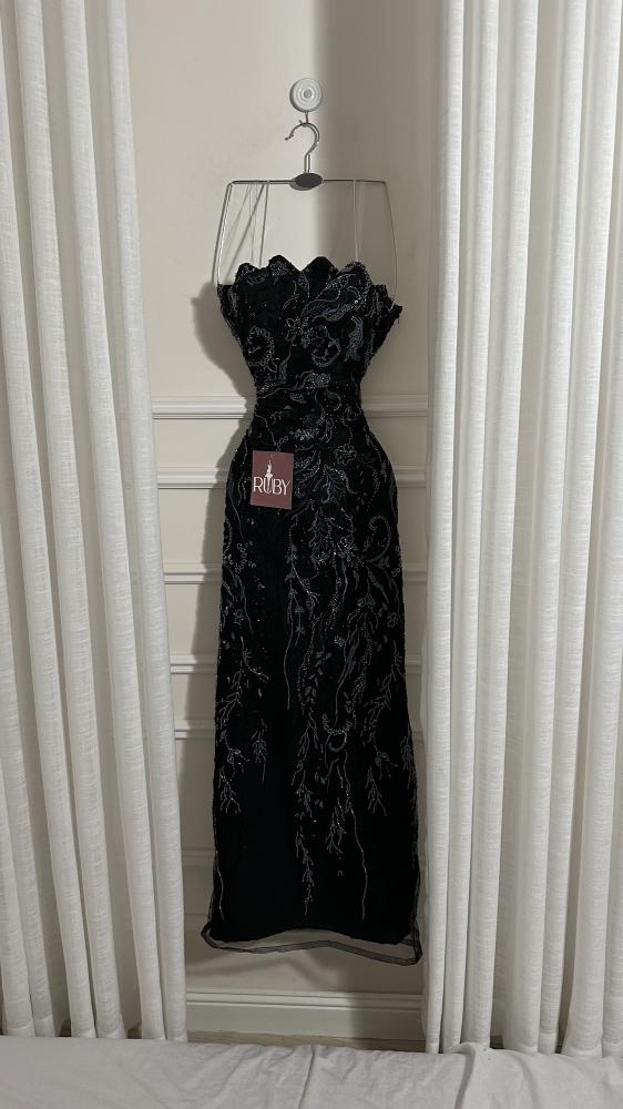 الفستان المعروض هو فستان سهرة طويل أسود اللون، يتميز بتصميم بدون حمالات (strapless). يزدان الفستان بتطريز أو خرز دقيق باللون الفضي الرمادي، يغطي كامل الفستان بنقوش نباتية متفرعة، مما يضيف لمسة من الأناقة والفخامة.