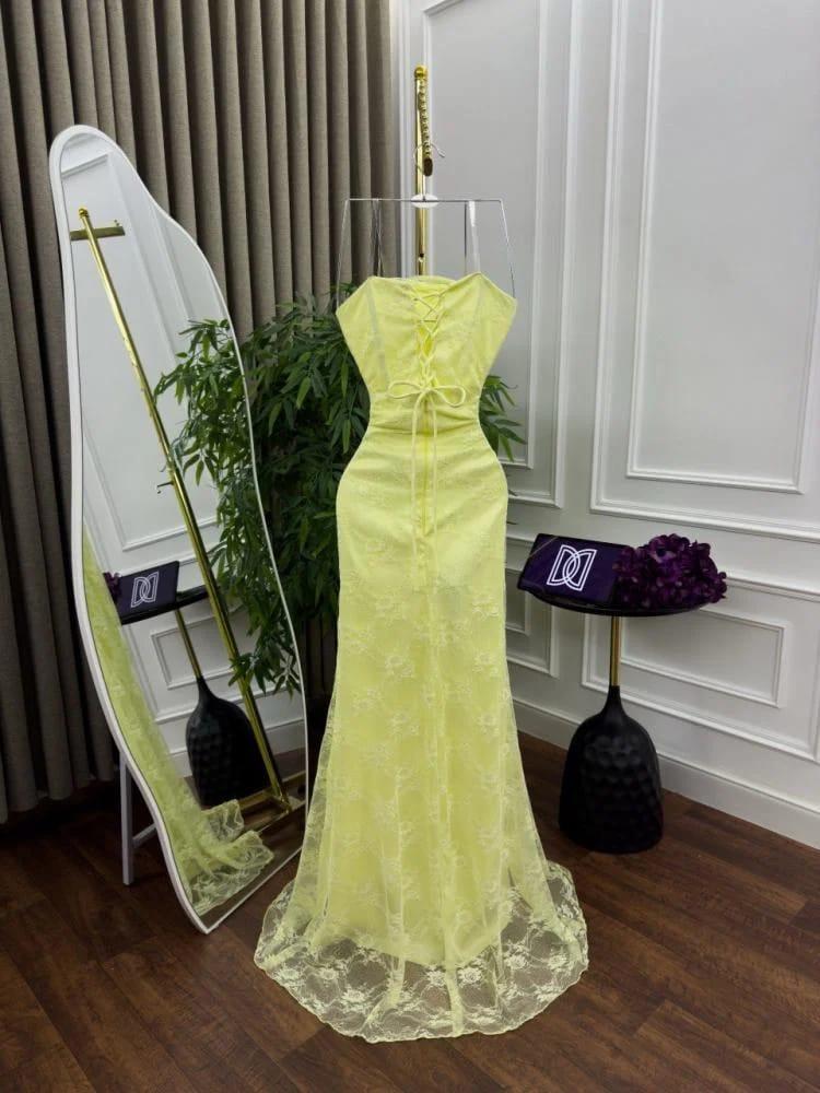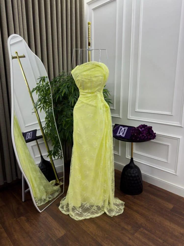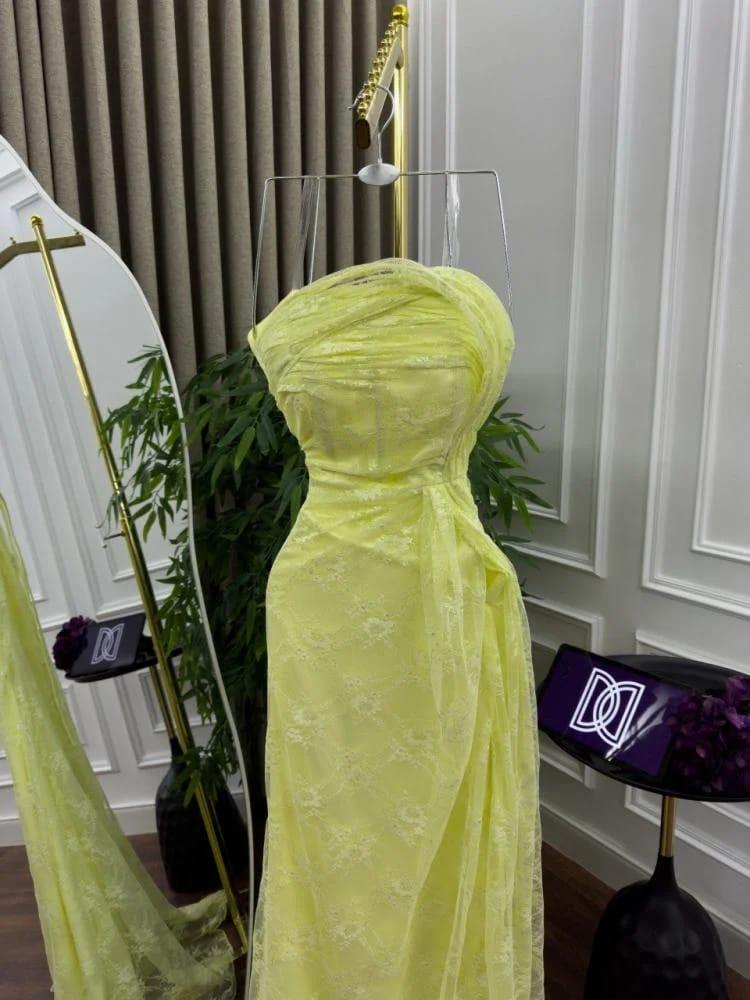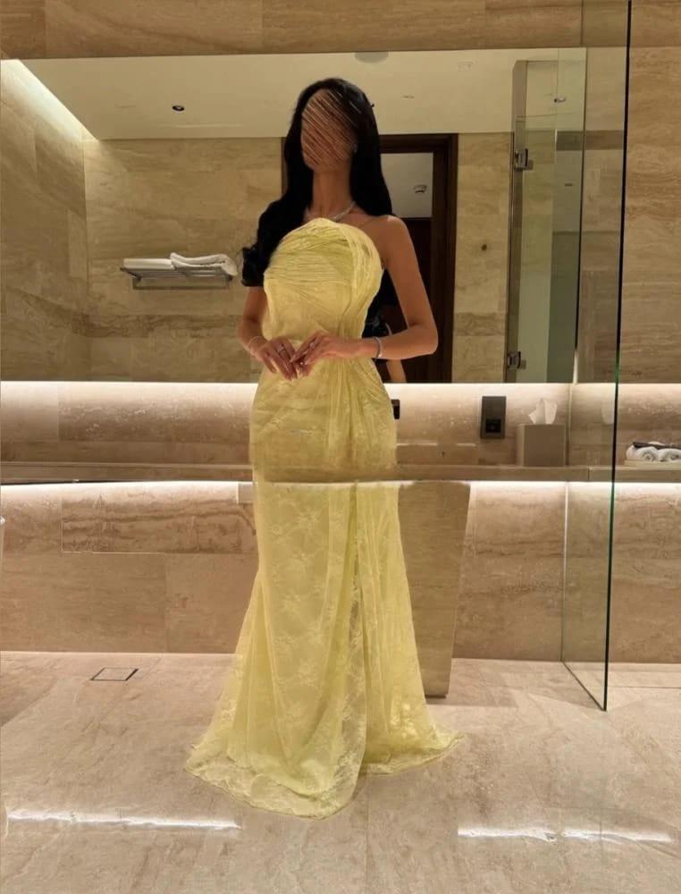 - اللون:الفستان بلون أصفر باهت (Pastel Yellow) هادئ، يُضفي إشراقة وأنوثة على الإطلالة.