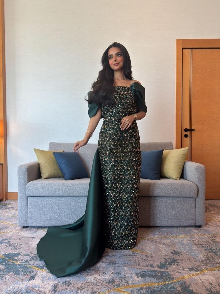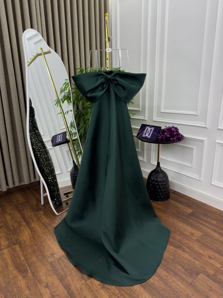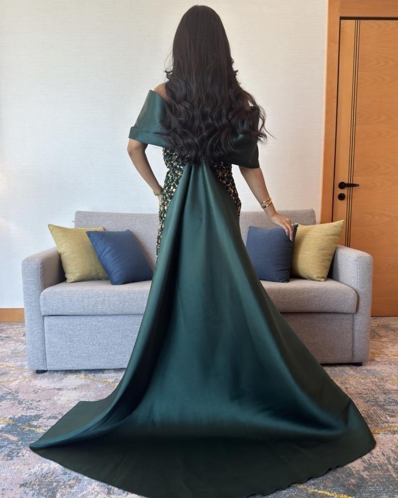 - الجزء العلوي: يتميز بأكتاف مكشوفة (Off-Shoulder) مع قطعة قماش سميكة من الساتان الأخضر الداكن ملفوفة بطريقة فنية حول الكتفين تشبه الشال أو الكاب، تضيف لمسة درامية وراقية للفستان.