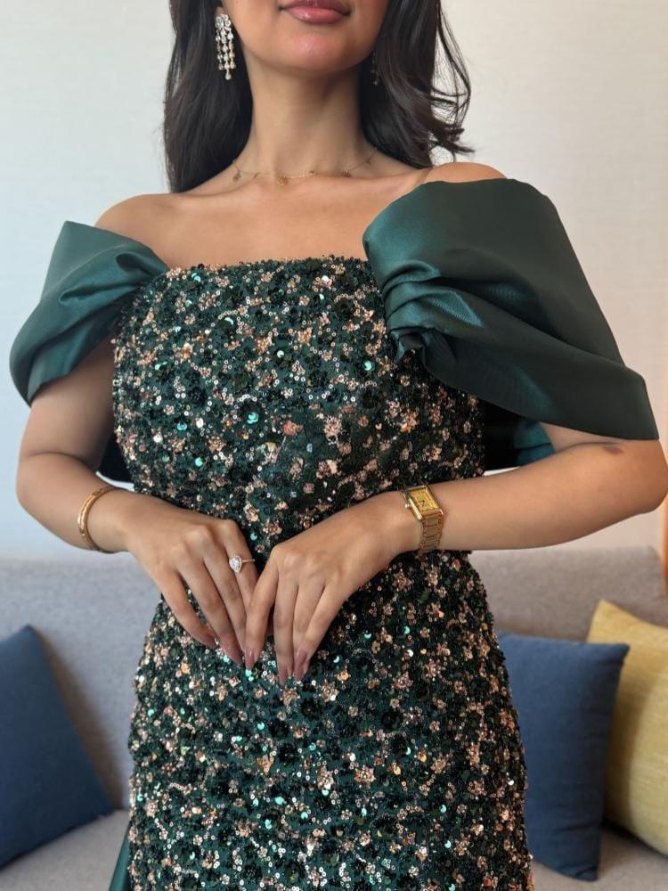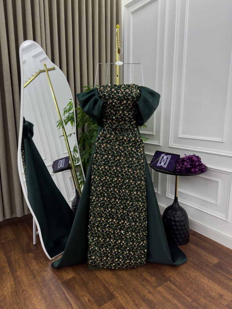 - القماش: القماش مزين بالكامل بالترتر اللامع والخرز الصغير بدرجات الأخضر والذهبي والفضي، مما يمنحه لمعانًا فاخرًا وفخامة بارزة.