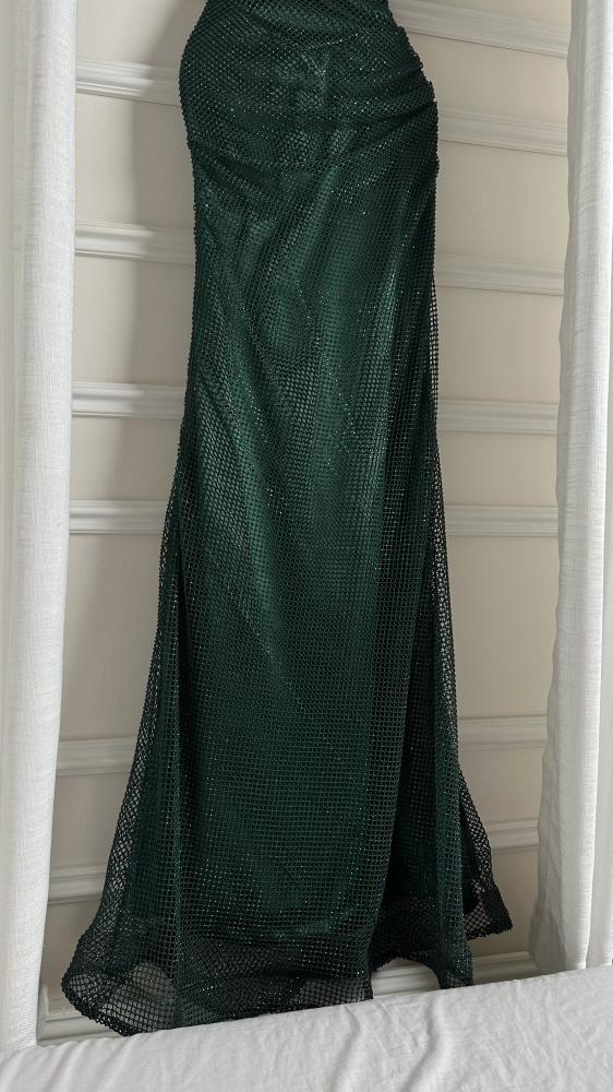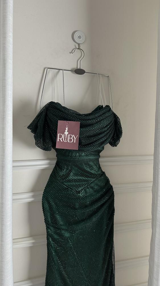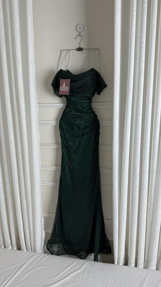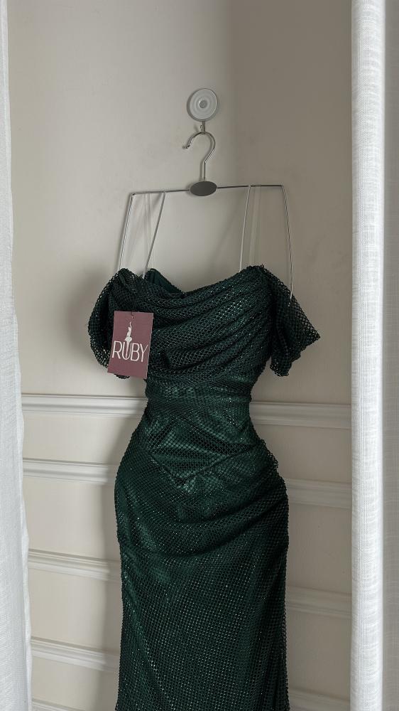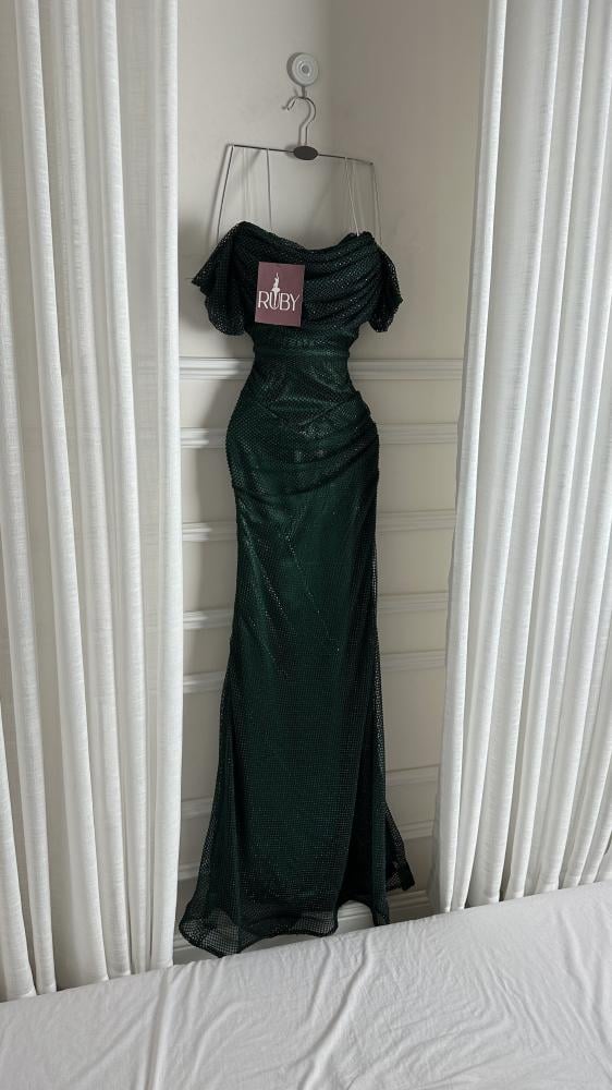 فستان سهرة طويل باللون الأخضر الداكن، يتميز بلمعة أو ترتر يمنحه مظهراً براقاً. يتميز الفستان بتصميم الكتف الواحد (أو مكشوف الكتفين)، وقصة ضيقة تبرز شكل الجسم، مع تنورة طويلة تنسدل حتى الأرض