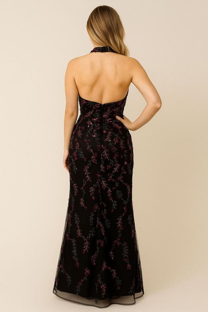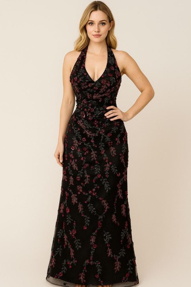 فستان سهرة طويل باللون الأسود، يتميز بتصميم أنيق ومزين بتطريزات باللونين الأحمر والرمادي الداكن.