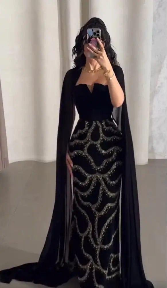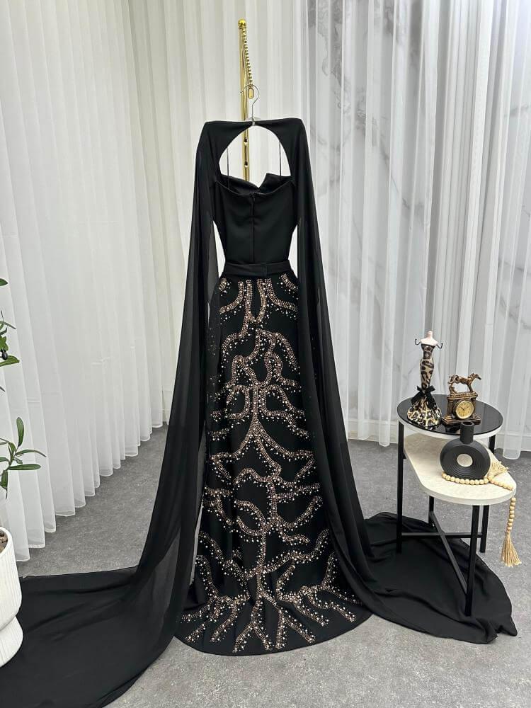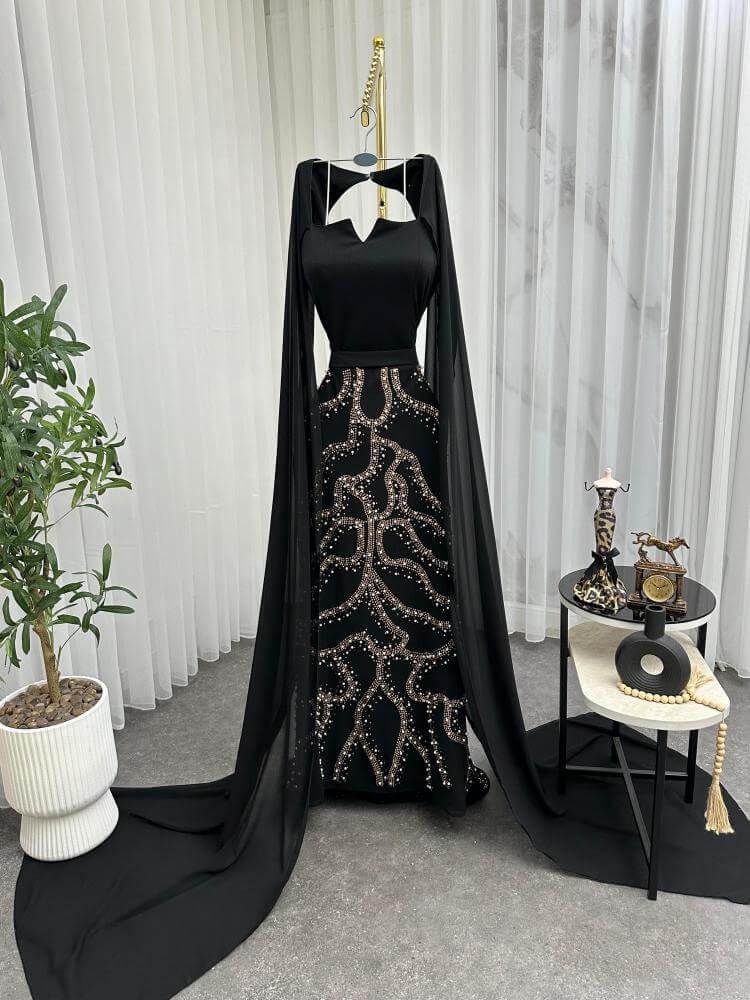 - الأكمام: بدون أكمام تقليدية، لكن الفستان يحتوي على كاب شفاف طويل يبدأ من الكتفين ويغطي الذراعين بشكل انسيابي.