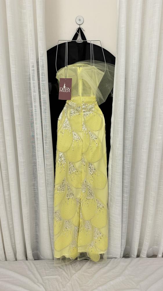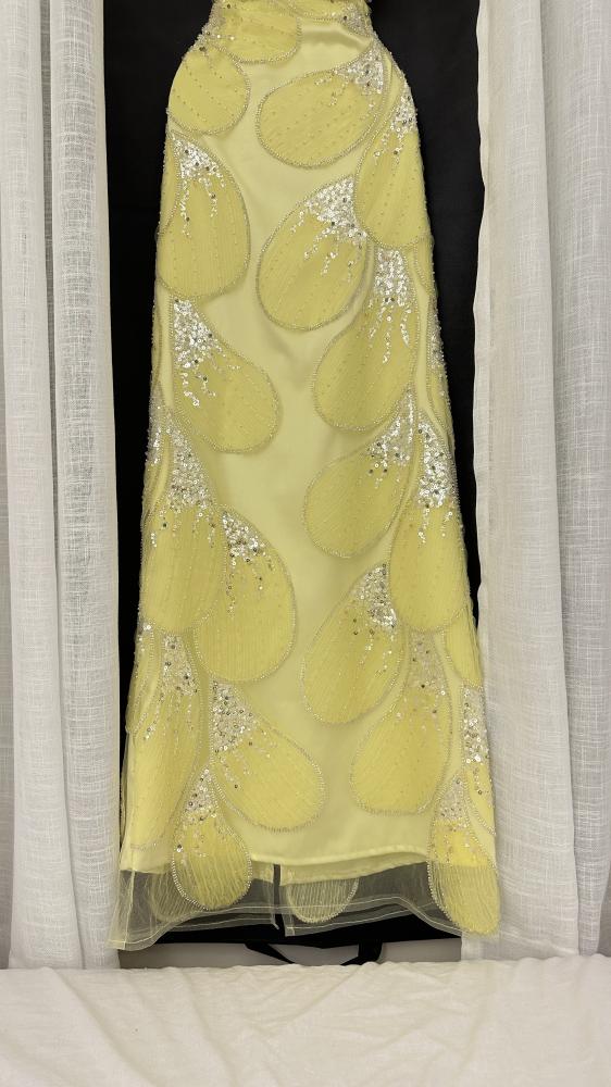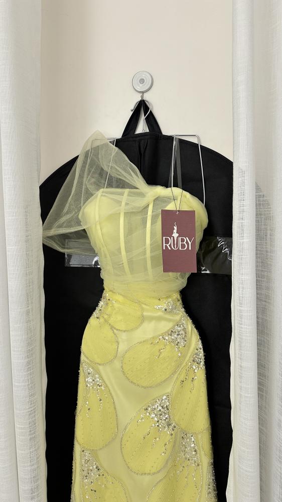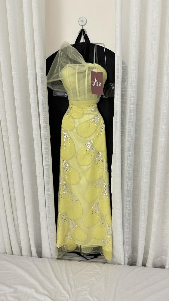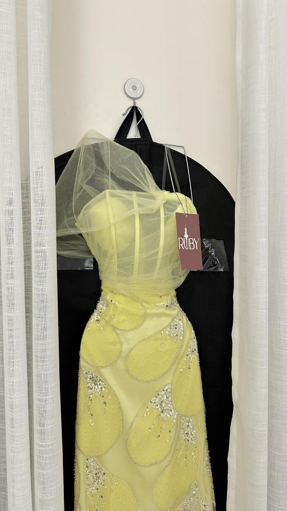 و فستان سهرة باللون الأصفر الفاتح، يتميز بتطريزات لامعة على شكل أوراق الشجر أو دوائر مزينة بالخرز أو الترتر الفضي.
