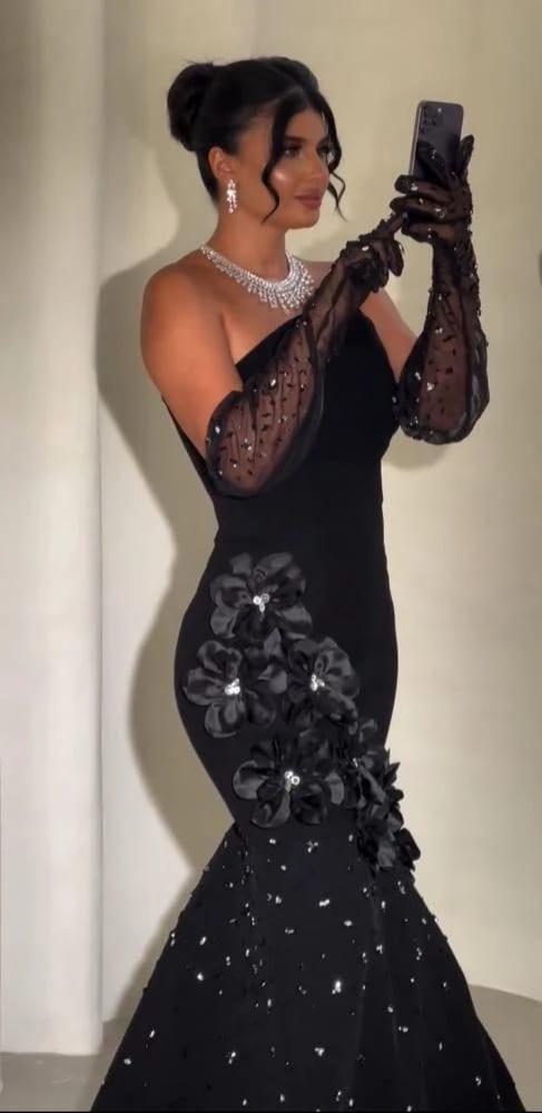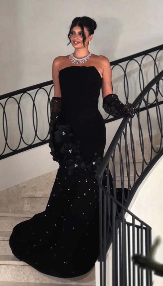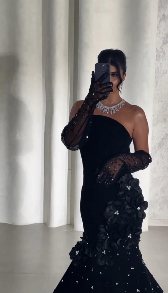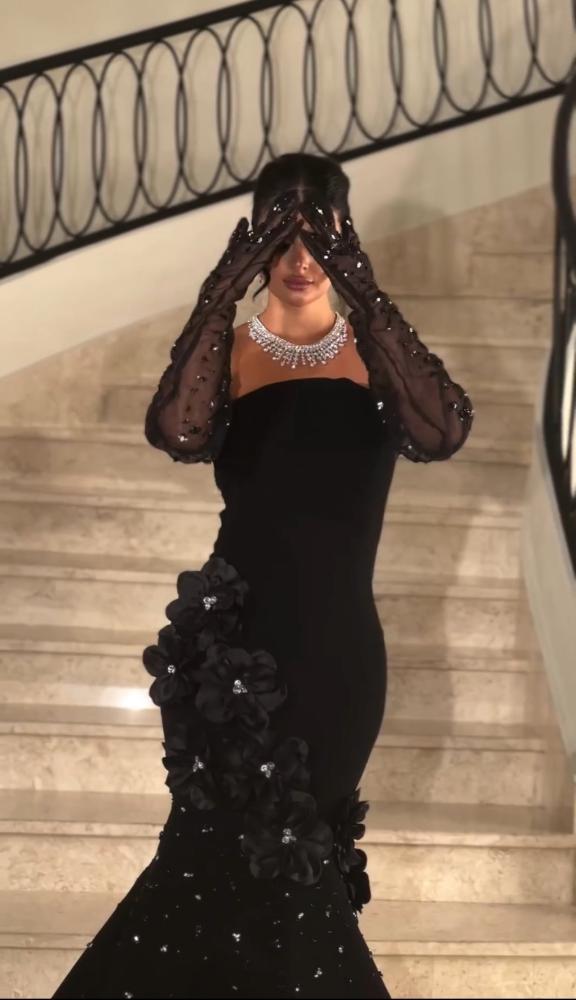 - قفازات شفافة طويلة من التول الأسود المطرز، مزينة بأزهار بارزة ثلاثية الأبعاد وأحجار لامعة، تضيف لمسة درامية ومترفة.