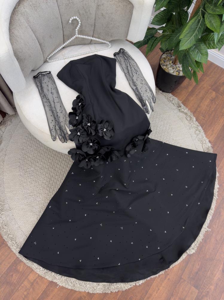 - مزين بورود بارزة ثلاثية الأبعاد سوداء مكدسة في منطقة الورك والفخذين، ما يضفي ملمساً غنياً.