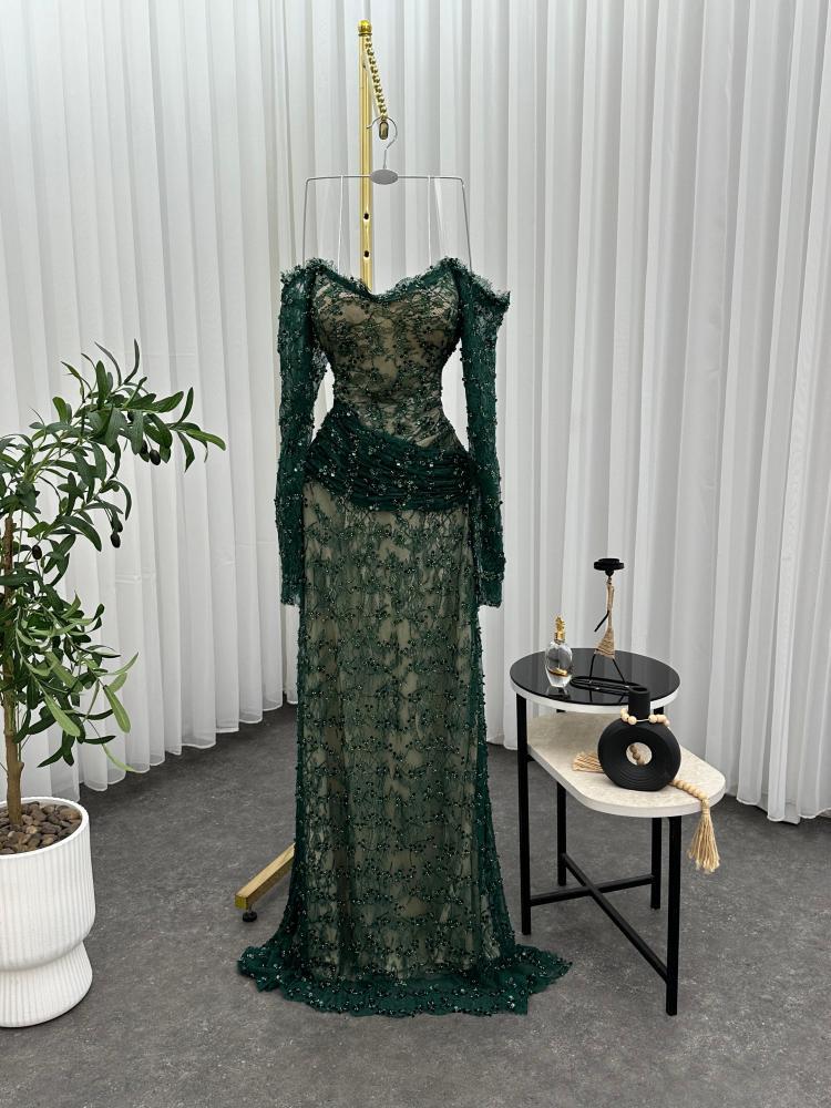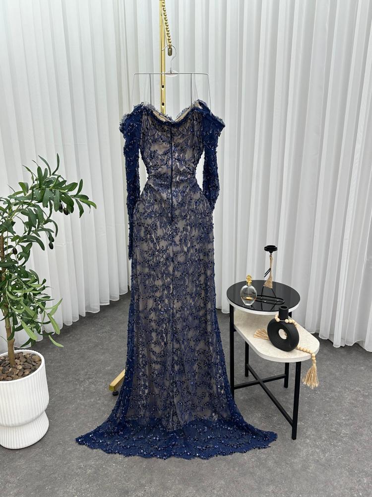 الأكمام: طويلة وشفافة، مصنوعة من نفس قماش الدانتيل المطرز.