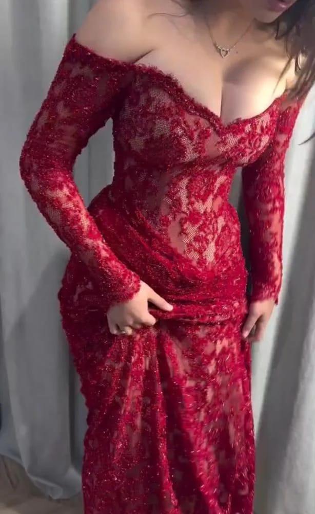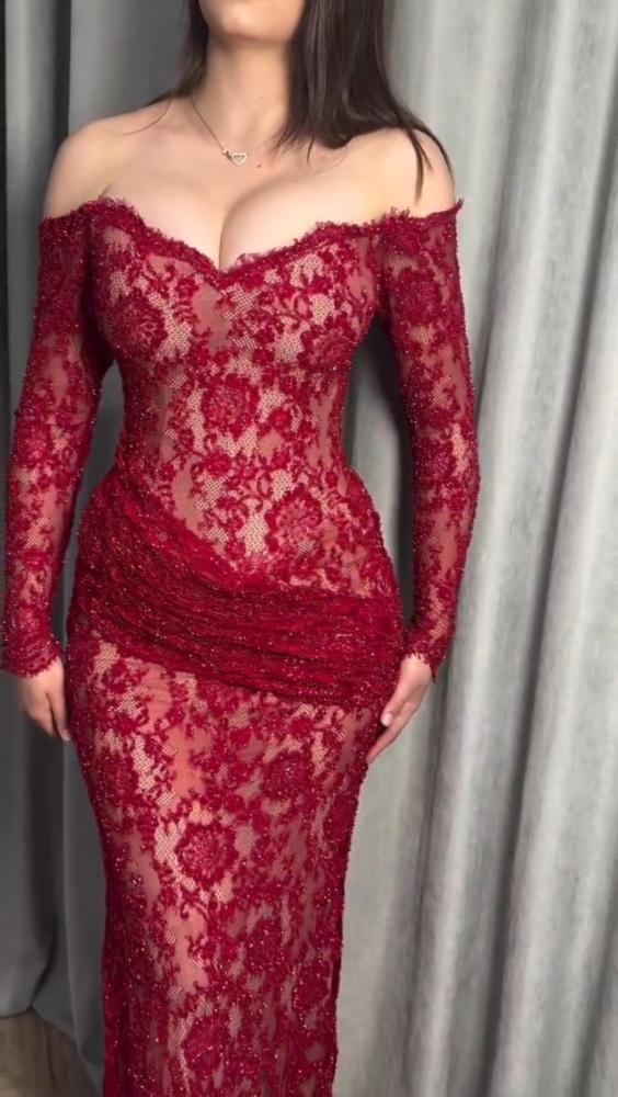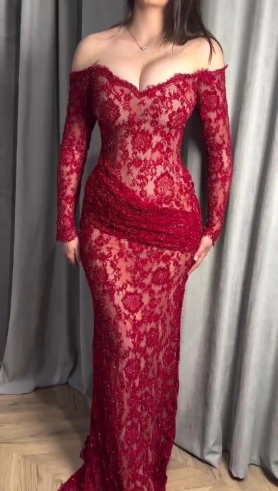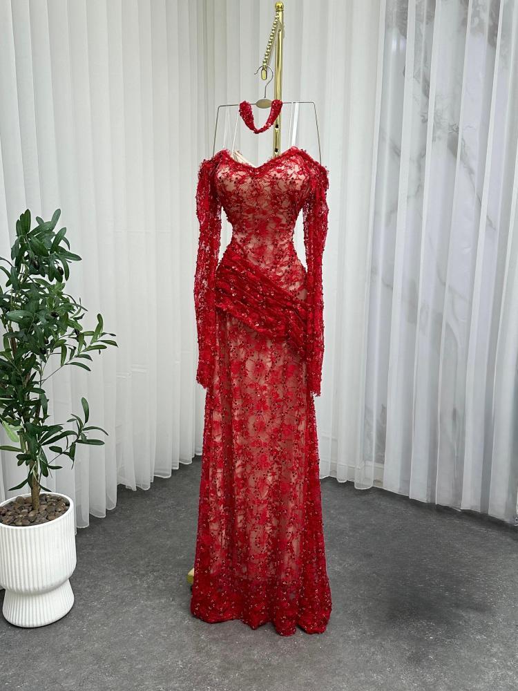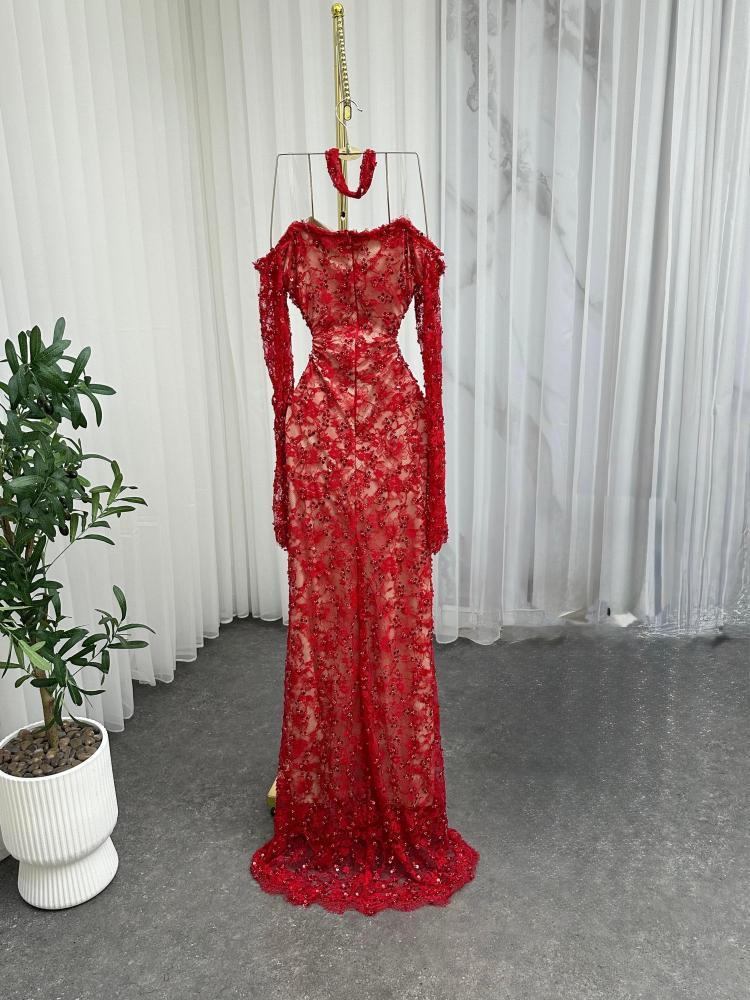 الخامة: مصنوع من قماش شفاف بلون البشرة، مغطى بطبقة من الدانتيل المطرز بالخرز الأحمر، ما يمنحه مظهراً راقياً ولامعاً.