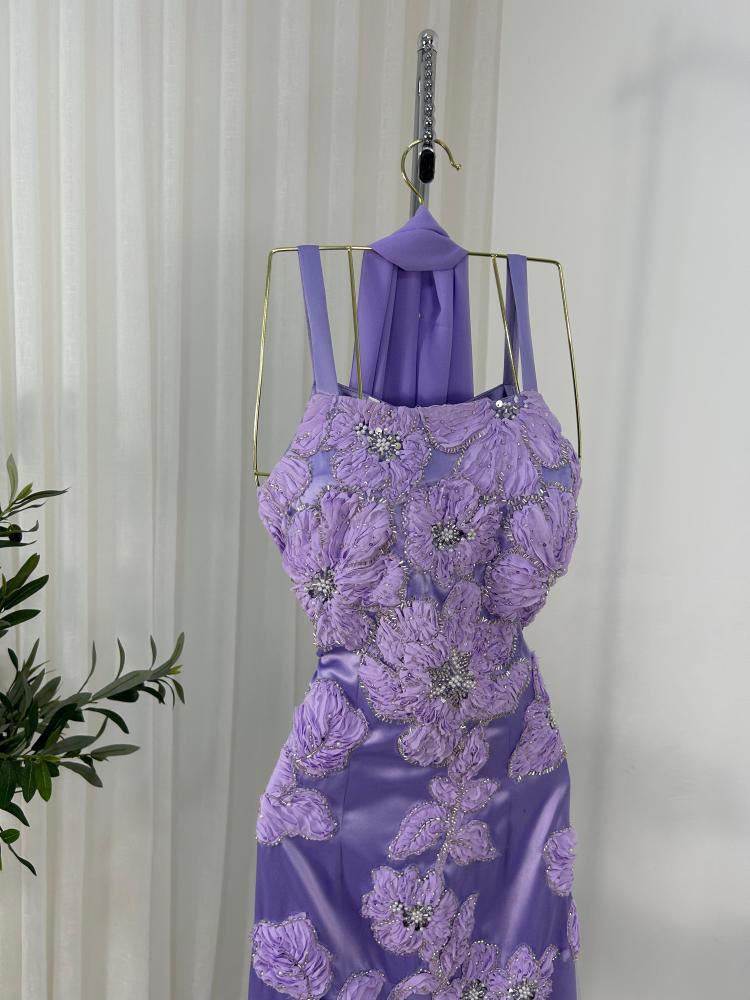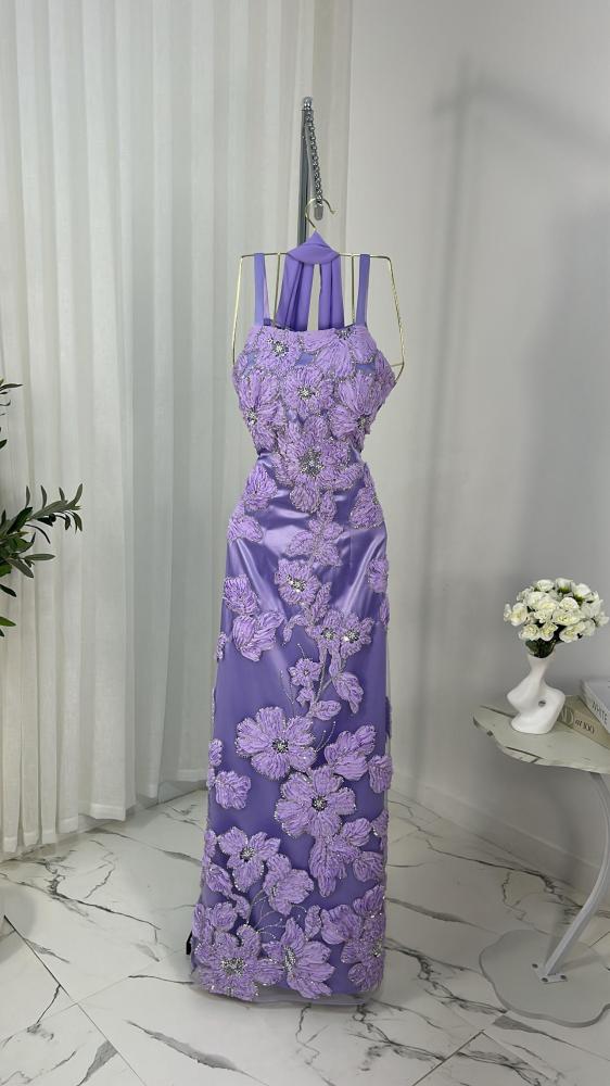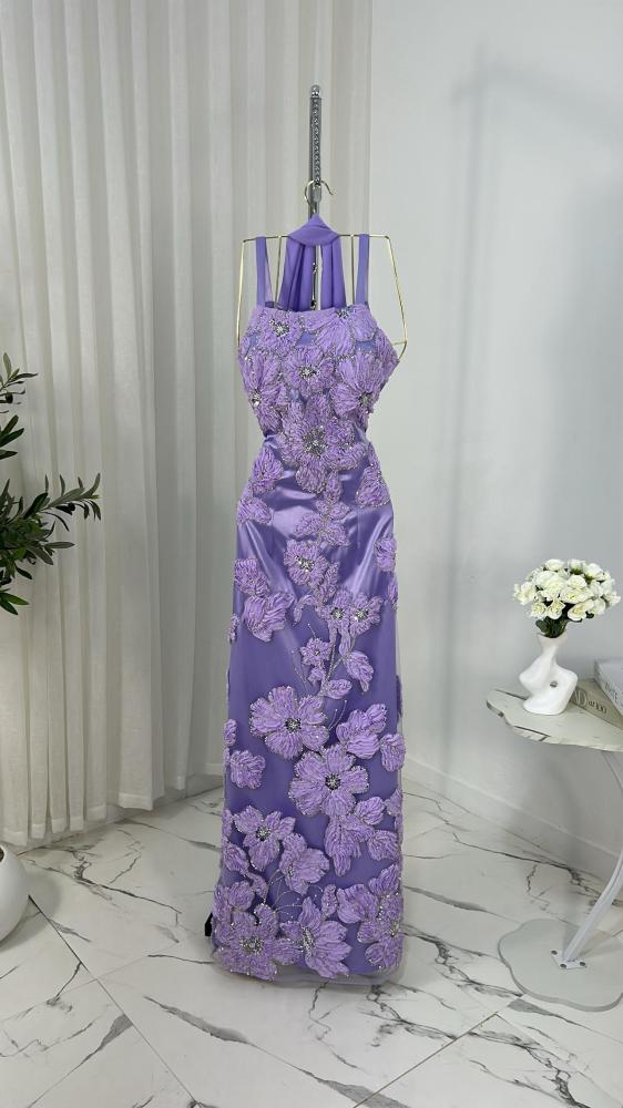 • اللون:لون الفستان: بنفسجي فاتح (ليلكي)، وهو لون راقٍ وأنثوي يُضفي لمسة من النعومة والرقي.