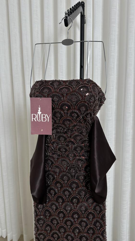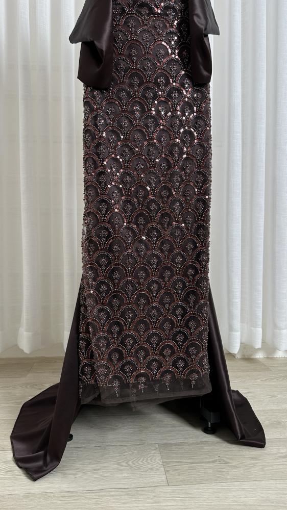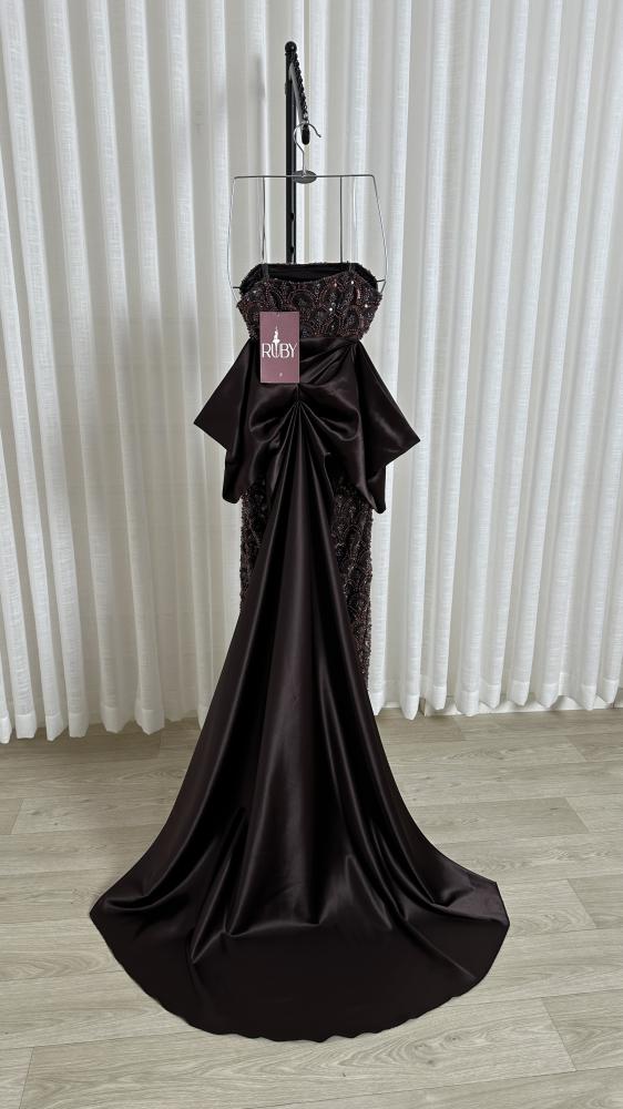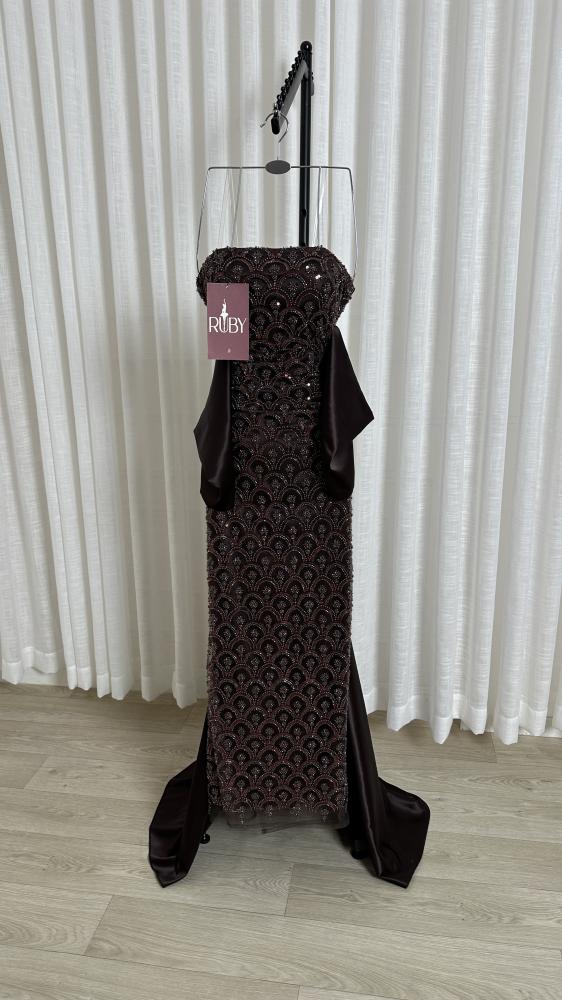 فستان سهرة طويل بلون داكن (يبو بنيًا ) مزين بالكامل بالخرز اللامع. يتميز الفستان بتصميم سترابلس (بدون أكمام) مع صدرية ضيقة، وينسدل بقصة مستقيمة و ضيقة على الجسم، وينتهي بذيل واسع من قماش التفتة الناعم يضفي لمسة