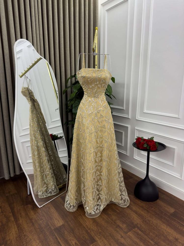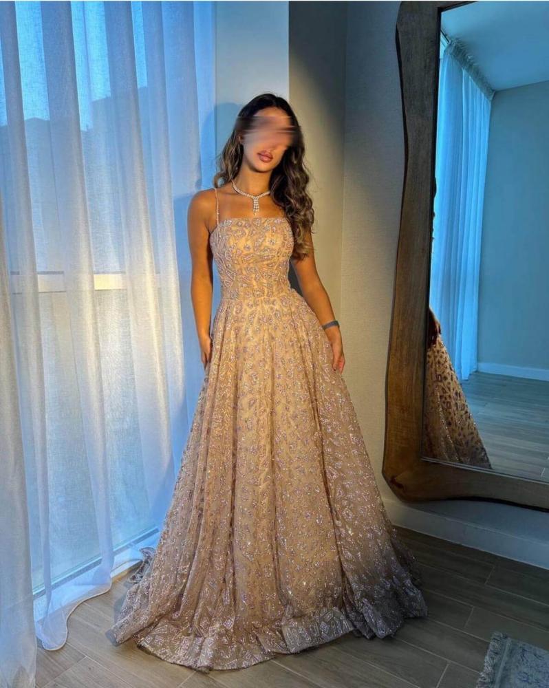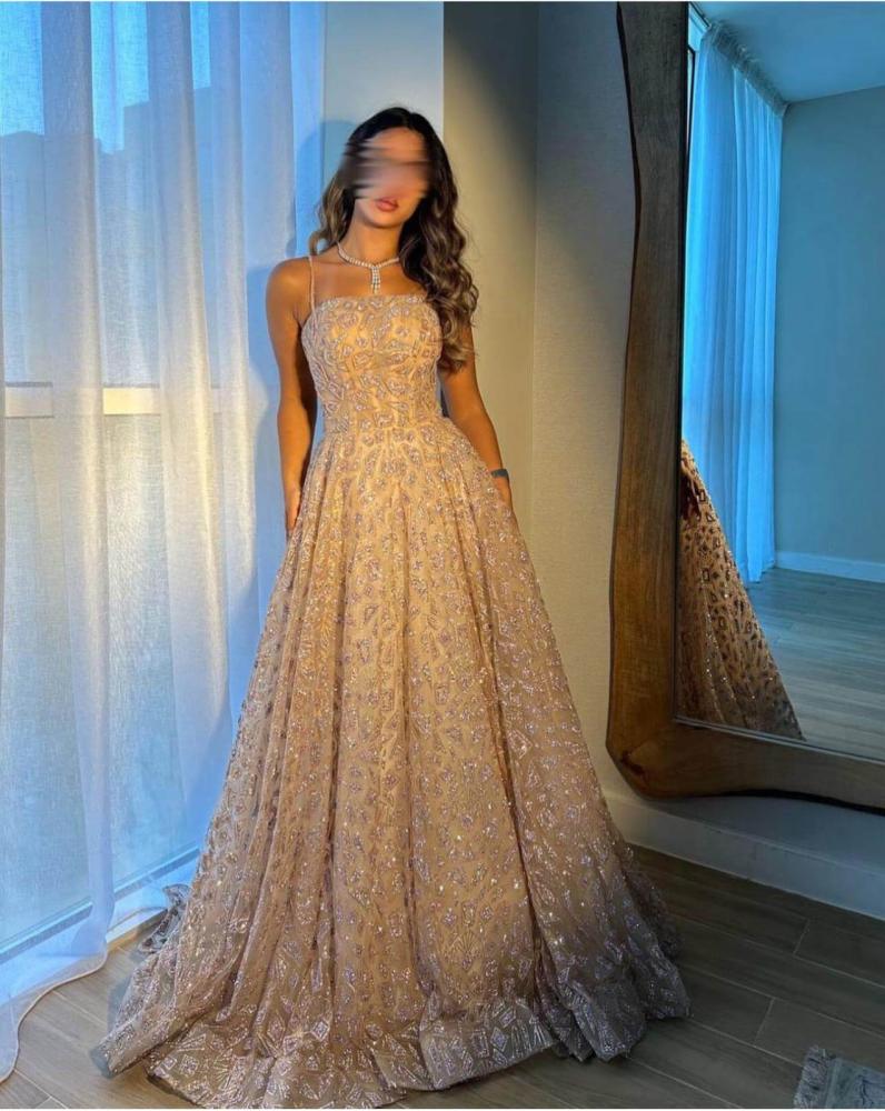 - التصميم العام:النوع: فستان سهرة طويل وفخم، بقصة A-line (على شكل حرف A)، حيث يبدأ ضيقًا من الأعلى ويتسع تدريجيًا نحو الأسفل.
