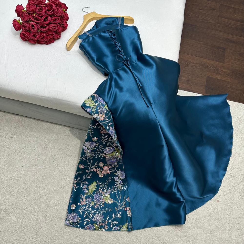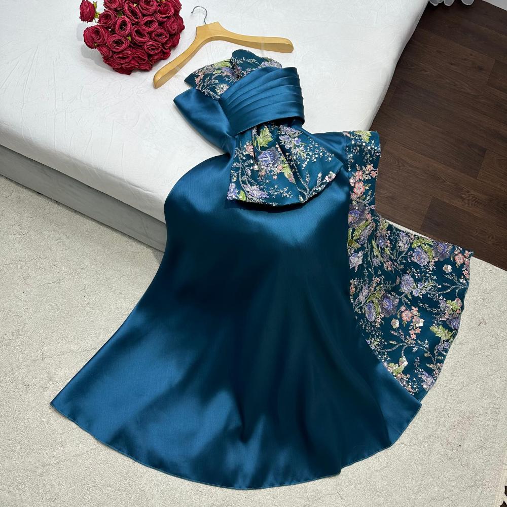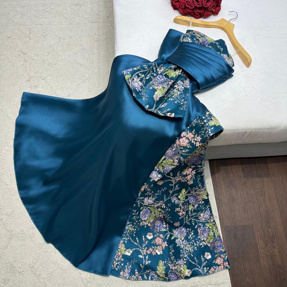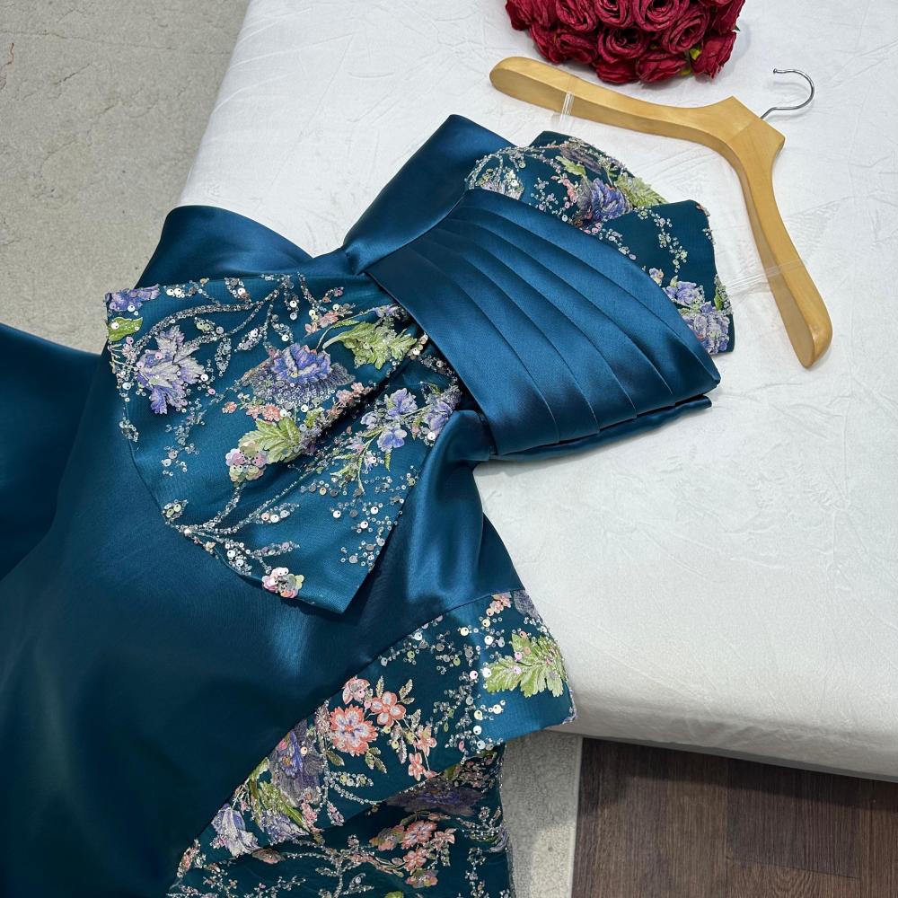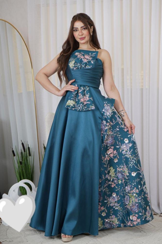 • يتميز الفستان بتصميم علوي بدون أكمام، مع ياقة غير متماثلة أو تصميم كتف واحد، ويحتوي على كسرات وتطريزات فاخرة بألوان متعددة مثل الوردي والأزرق والأخضر، مع لمسات من الترتر أو الخرز اللامع على منطقة الصدر والخصر.