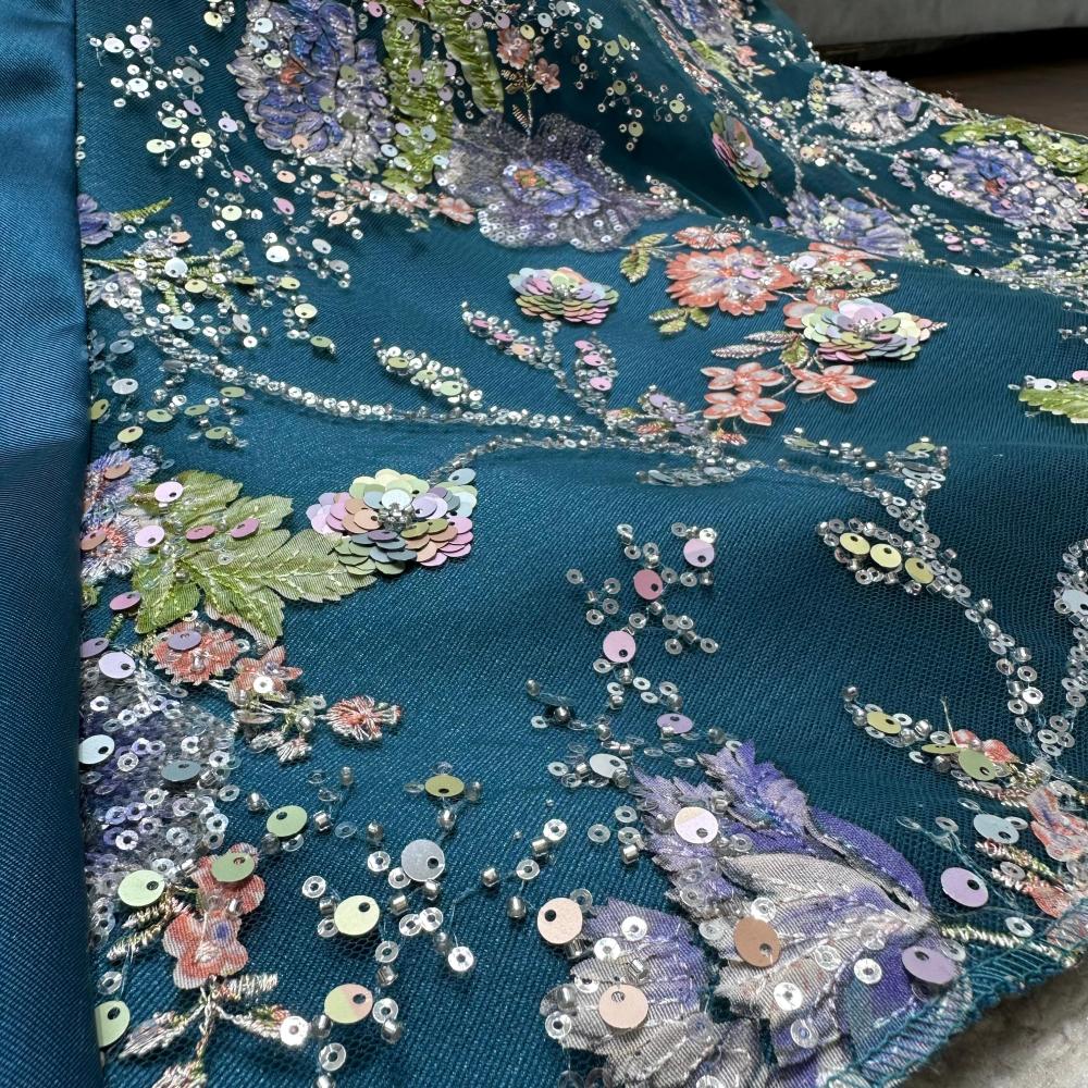 • التنورة طويلة ومنسدلة، وتتميز بوجود جزء جانبي مزين بنفس التطريزات اللامعة الموجودة في الجزء العلوي، مما يضيف لمسة من الفخامة والتميز للفستان.