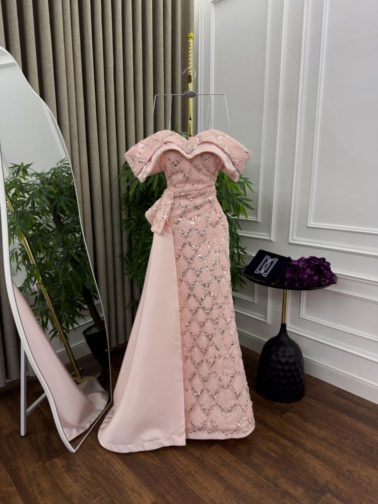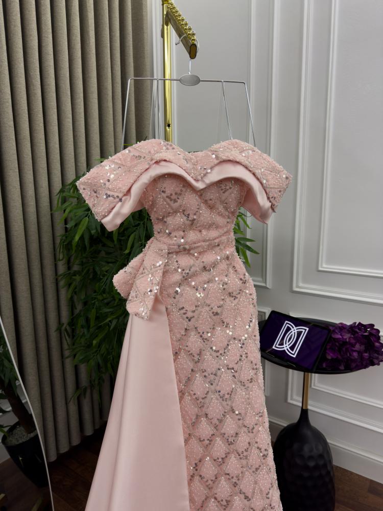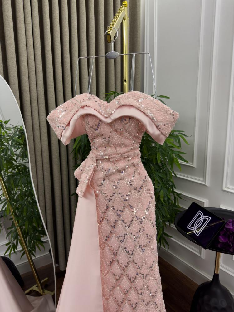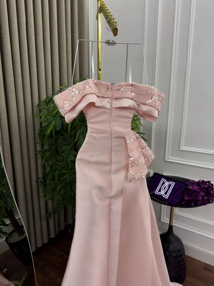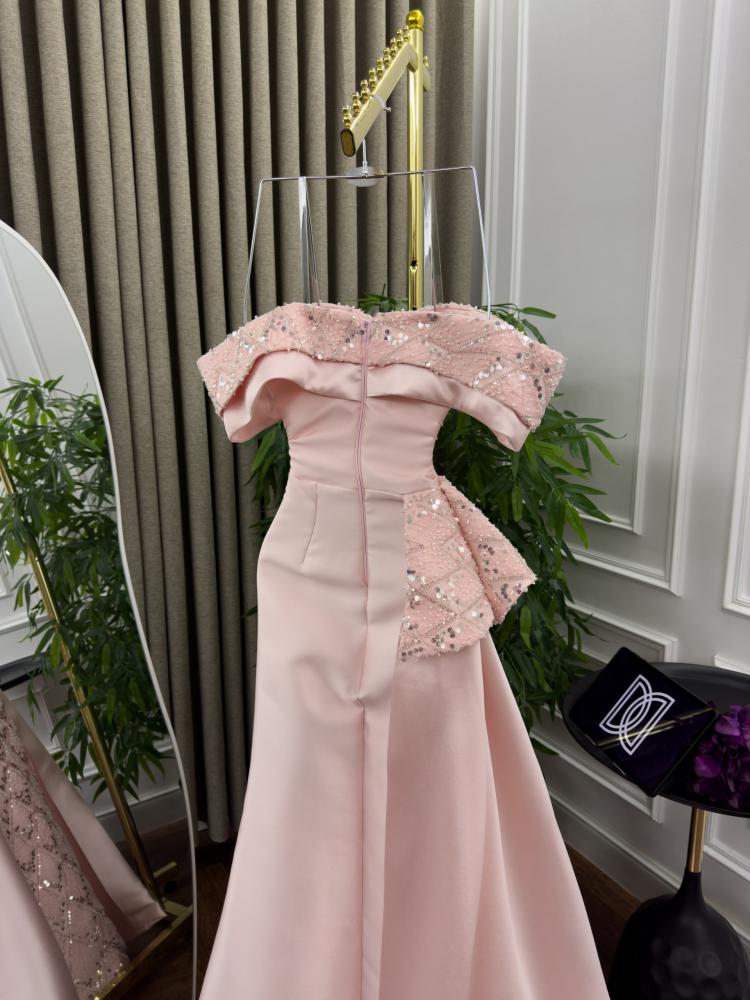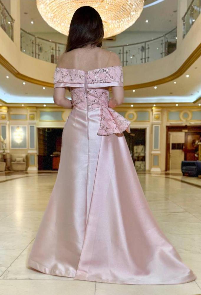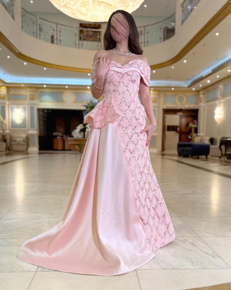 - يتميز بياقة مفتوحة على الكتفين (Off-shoulder) وأكمام طويلة، وكلاهما مزين بتطريزات أو زخارف فضية لامعة.