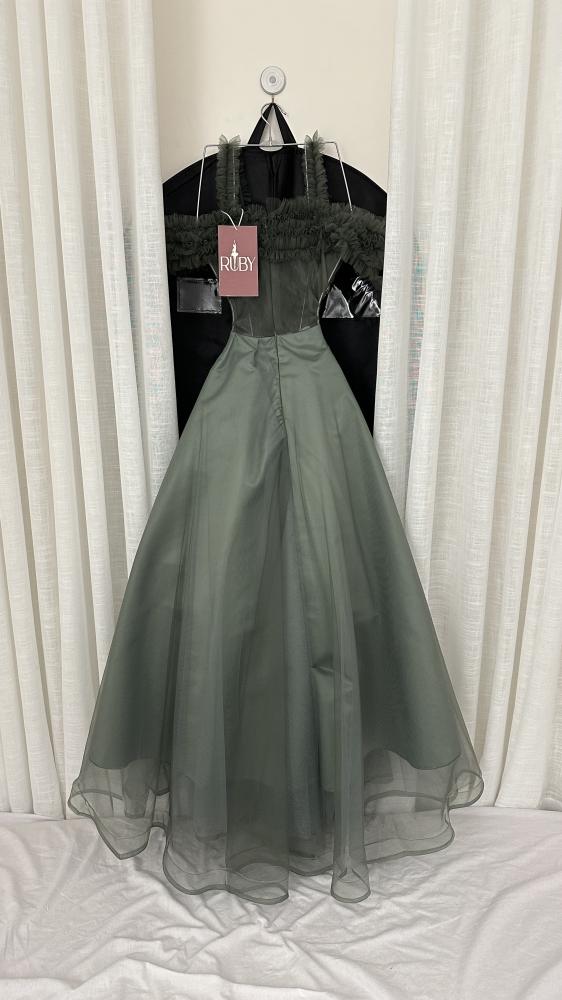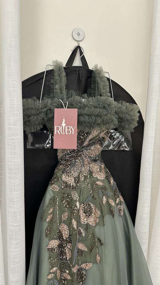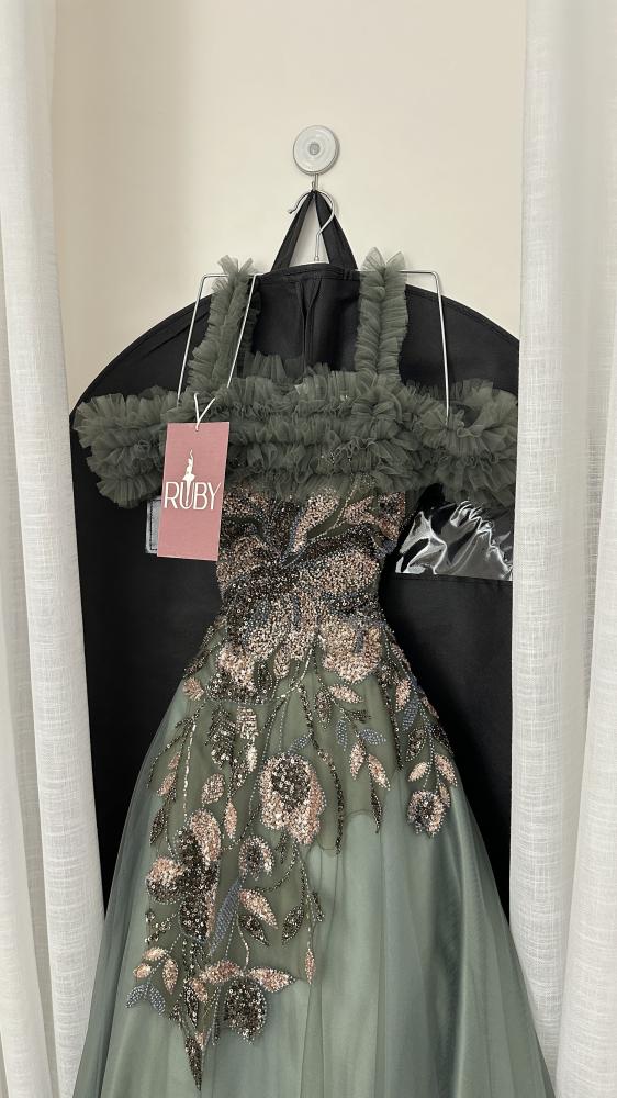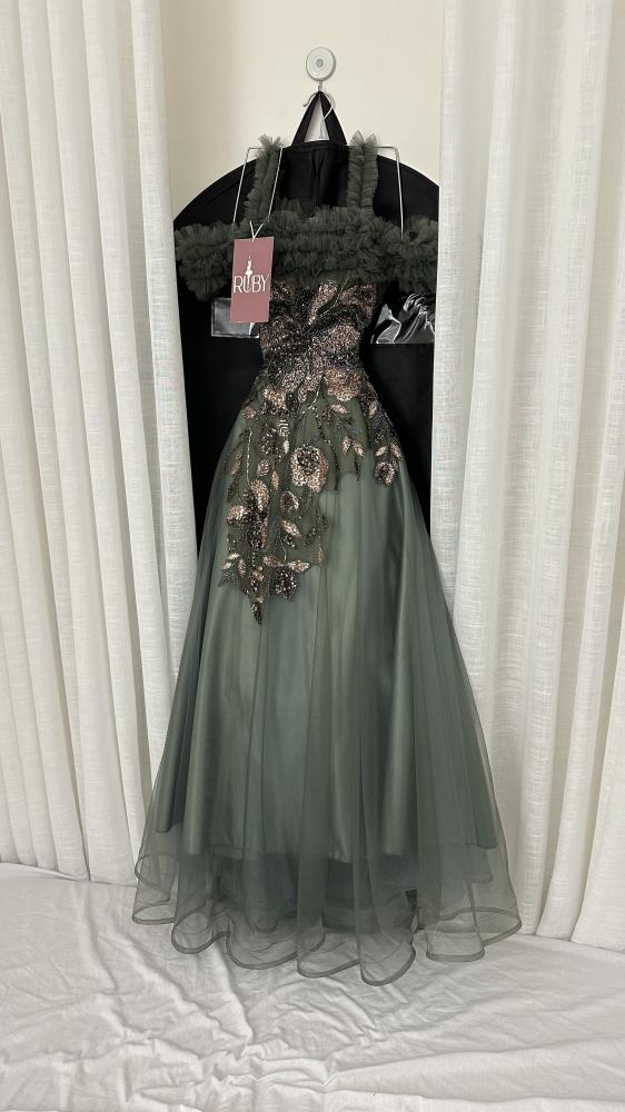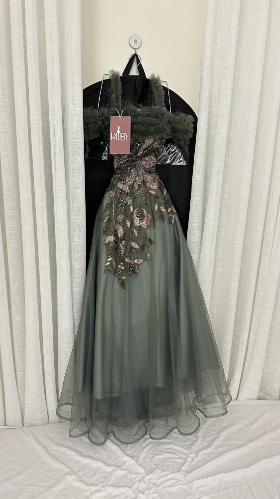 فستان سهرة طويل بلون زيتي أو أخضر داكن. يتميز بتطريز لامع على منطقة الصدر والجزء العلوي من التنورة، والذي يبدو على شكل أوراق شجر أو زهور باللون البرونزي أو الذهبي. الأكتاف مصممة بشكل "أوف شولدر" مع طبقة منفوشة أو كشكشة تضفي عليه لمسة ملكية وفخمة. الفستان ذو تصميم واسع ومنفوش من الأسفل، مما يمنحه مظهرًا أنيقًا ومناسبًا للمناسبات الرسمية.