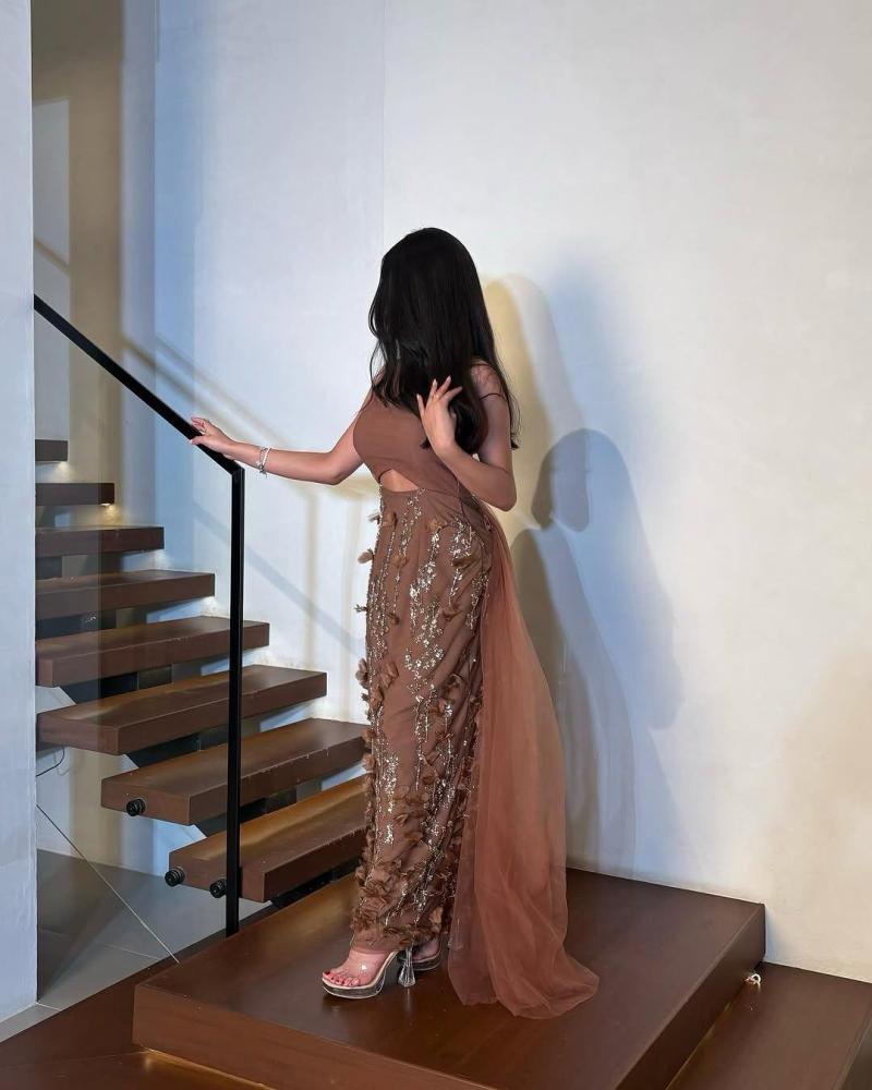 - الفستان مزود بتطريزات لامعة وناعمة تنعكس تحت الإضاءة، ما يجعله ملفتًا في الإطلالات الليلية.