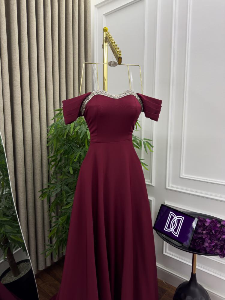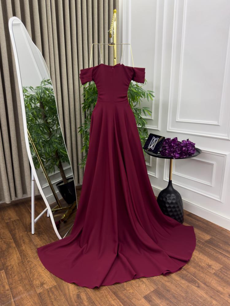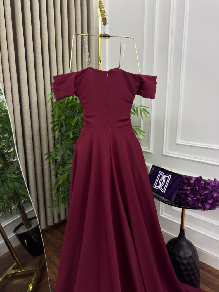 - اللون والخامة:الفستان باللون العنابي الداكن (Burgundy)، وهو لون أنيق وفخم يُناسب السهرات والمناسبات الخاصة.