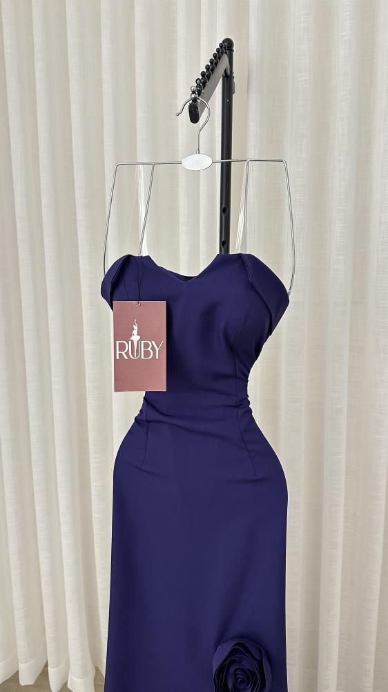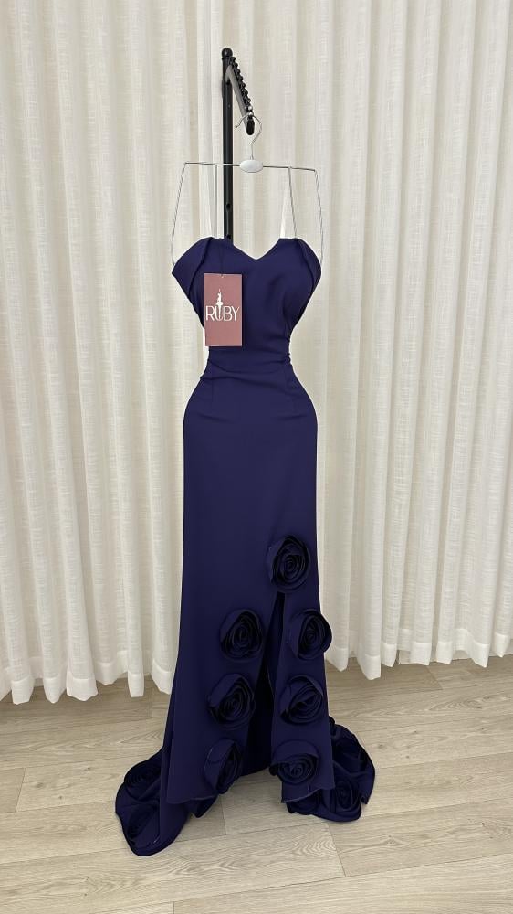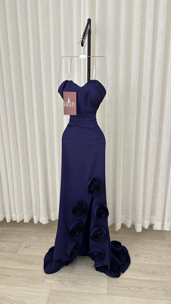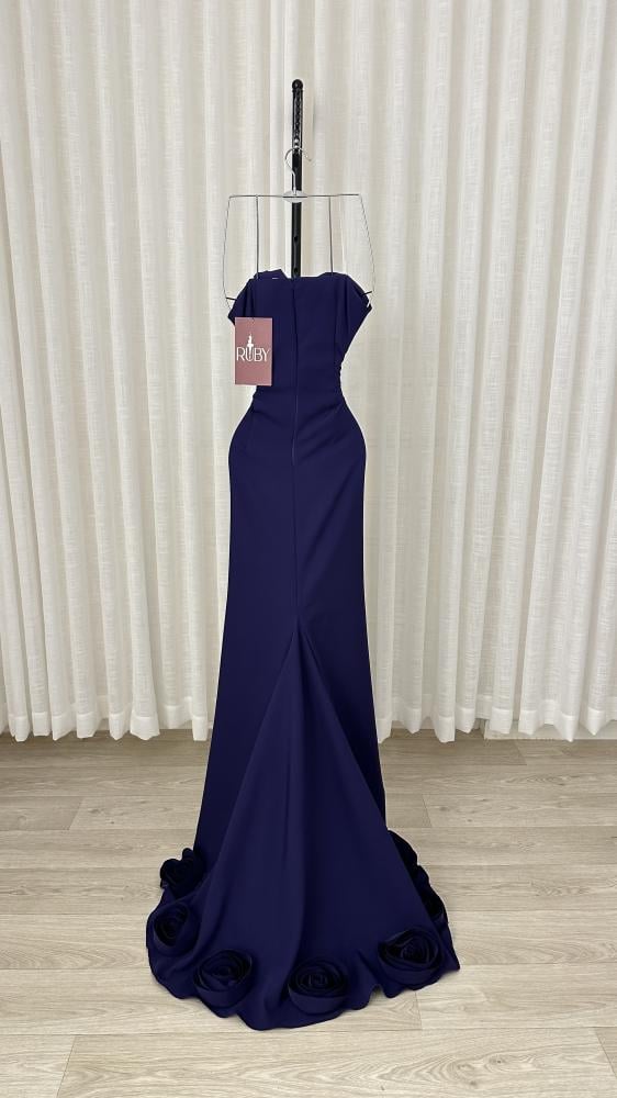 فستان سهرة طويل باللون الكحلي الداكن، يتميز بتصميم أنيق وجذاب.