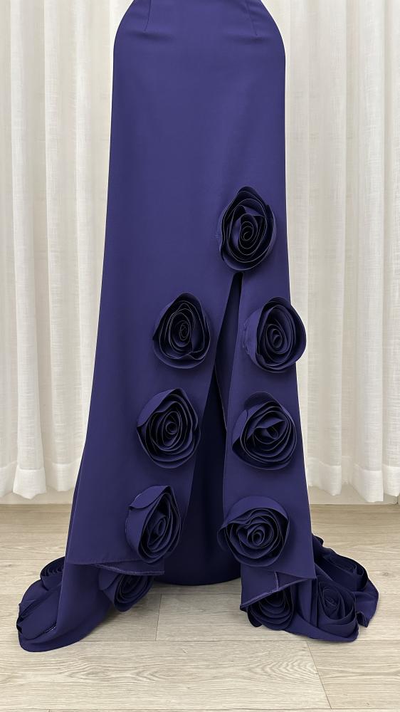 يزين الفستان من الأسفل ورود كبيرة بارزة ثلاثية الأبعاد مصنوعة من نفس قماش الفستان، موزعة بشكل فني على طول الفستان ومنطقة الذيل، مما يضفي عليه لمسة جمالية وفخامة.