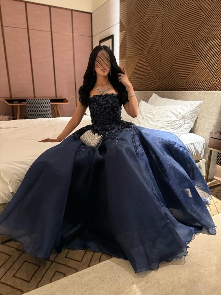 - الستايل: فستان طويل ومنفوش (Ball Gown)، يمتد حتى الأرض، مع تنورة واسعة تعطي مظهرًا ملكيًا.