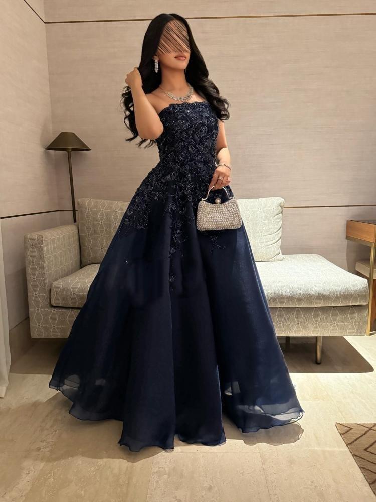 - القصّة: بدون أكمام (Strapless)، تكشف الكتفين، مما يعطي مظهرًا أنثويًا وأنيقًا.