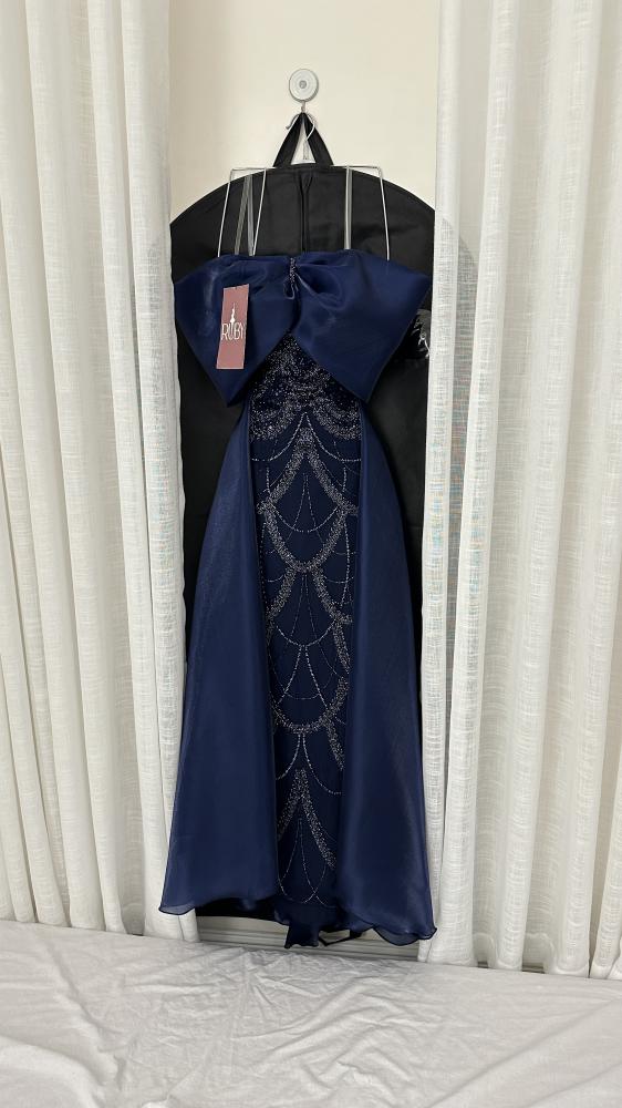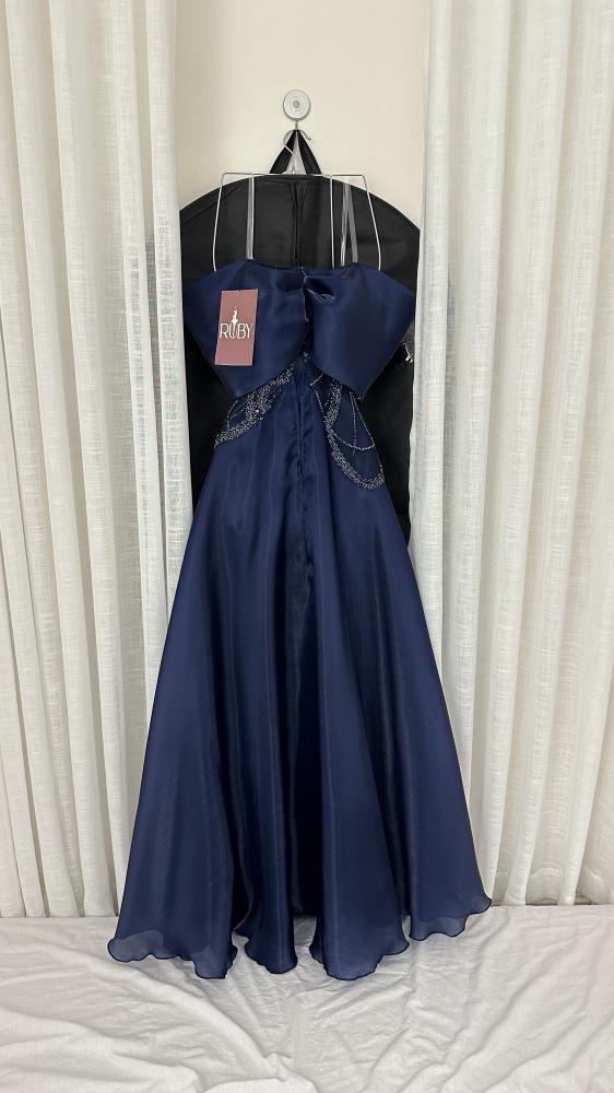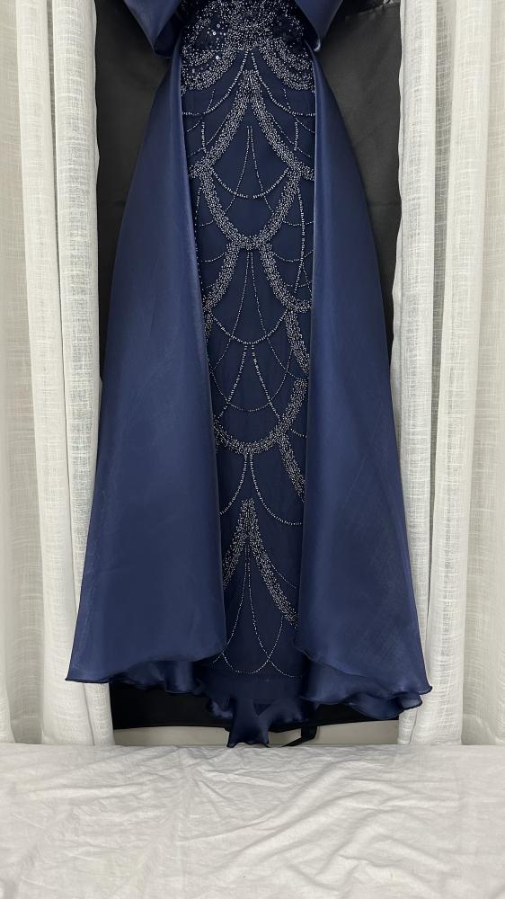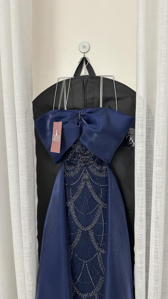 فستان سهرة طويل باللون الكحلي الداكن، يتميز بتصميم أنيق ومزيّن بتطريزات لامعة على شكل خطوط متعرجة على الجزء السفلي من الفستان.