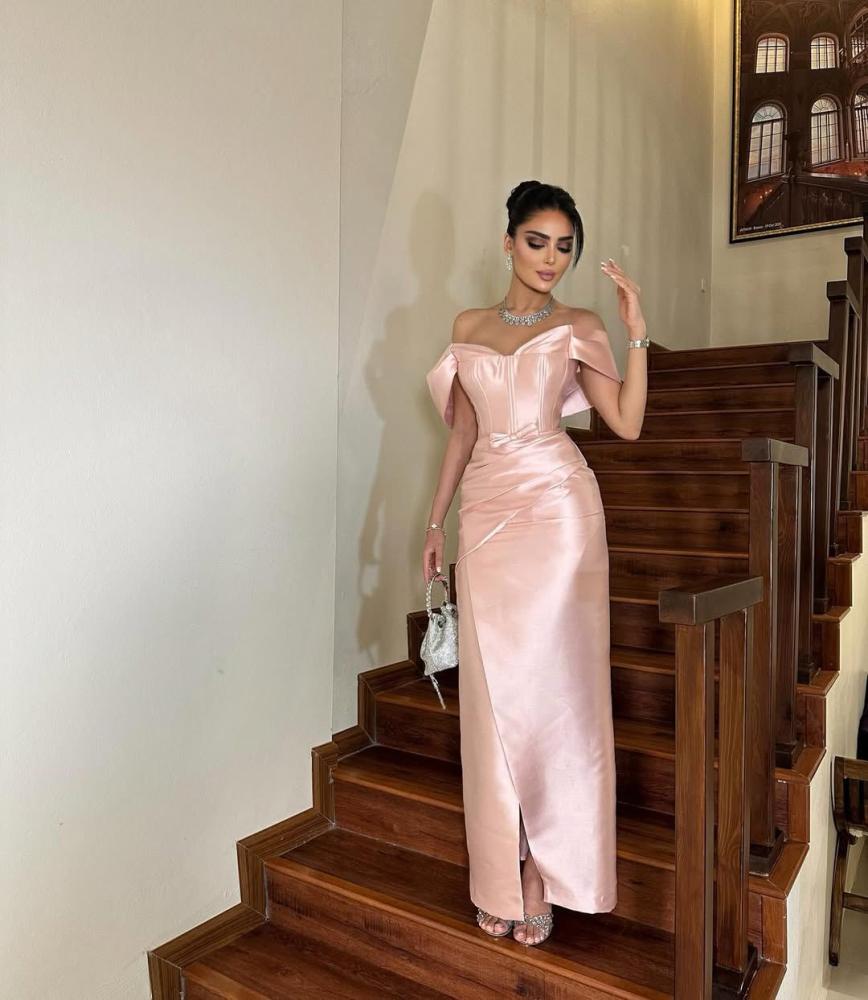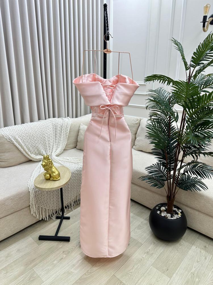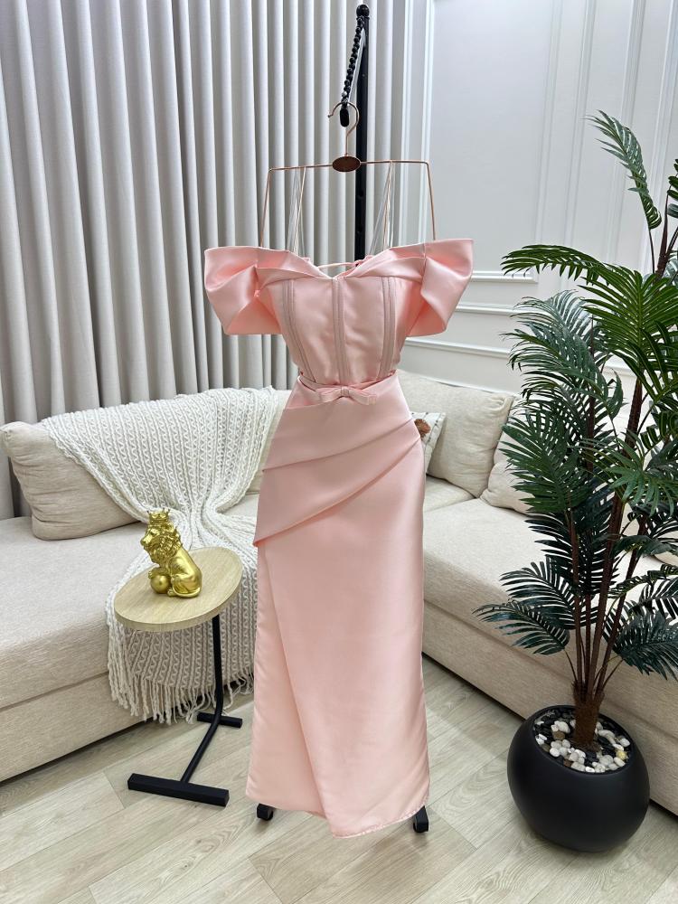 لون الفستان وردي فاتح مائل إلى البيج الهادئ (Blush Nude) بلون ساتان لامع، مما يمنحه لمعة راقية وبسيطة.